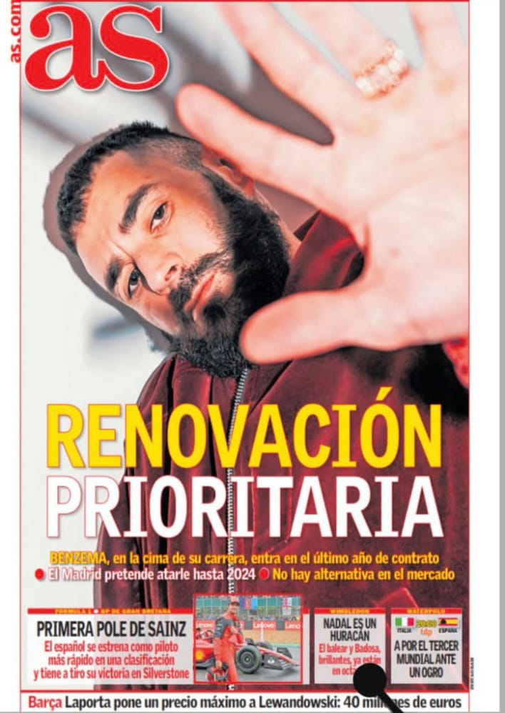 تصدر النجم الفرنسي كريم بنزيما قائد فريق ريال مدريد الإسباني غلاف صحيفة آس لعدد اليوم، بعدما قرر النادي الملكي تمديد عقده مع الفريق موسم إضافي ليستمر حتى عام 2024.