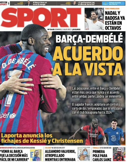 قالت صحيفة سبورت في غلافها إن برشلونة اقترب بالفعل من التوصل لاتفاق من أجل تمدبد عقد ديمبلي، حيث عنونت بـ برشلونة وديمبلي على اتفاق شبه نهائي.
