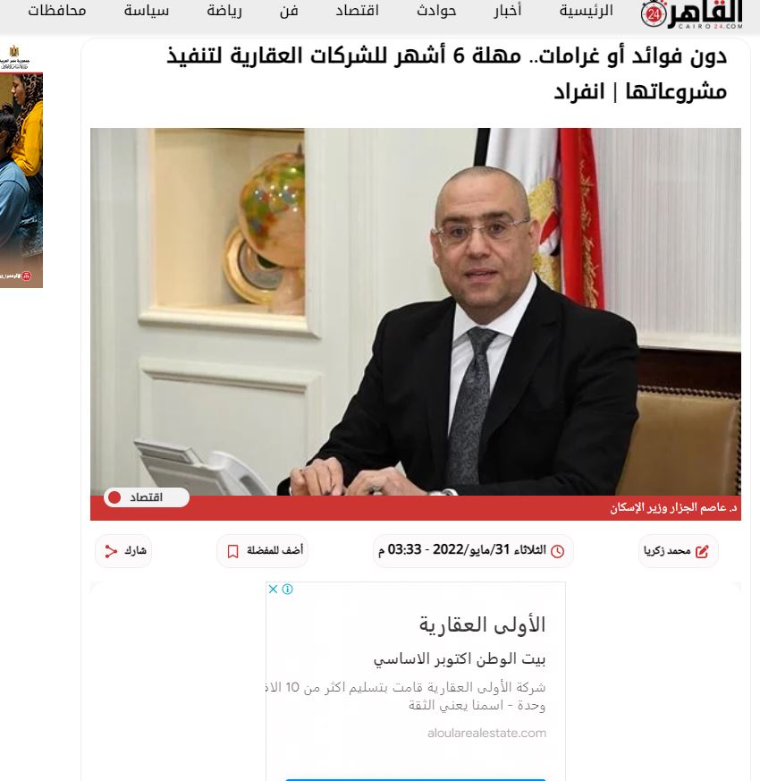 جدير بالذكر، أن القاهرة 24، نشر في وقت سابق، قرار موافقة الدكتور عاصم الجزار وزير الإسكان والمرافق والمجتمعات العمرانية، بمنح شركات الاستثمار العقاري مهلة 6 أشهر إضافية للمشروعات الجاري تنفيذها مع وزارة الإسكان، دون إضافة فوائد أو غرامات، نظرًا للظروف الاقتصادية الراهنة، وارتفاع أسعار البناء.