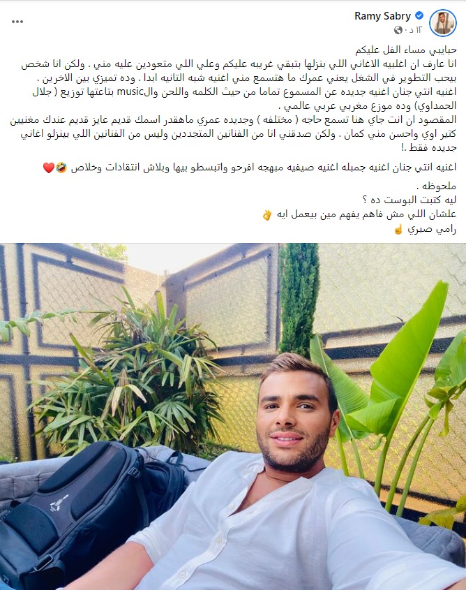 وكتب رامي صبري، منشورًا عبر حسابه الرسمي على فيسبوك، قال فيه: حبايبي، مساء الفل عليكم، أنا عارف إن أغلبية الأغاني اللي بنزلها بتبقي غريبة عليكم، وعلى اللي متعودين عليه مني، ولكن أنا شخص بيحب التطوير في الشغل، يعني عمرك ما هتسمع مني أغنيه شبه التانية أبدًا، وده تميزي بين الآخرين.