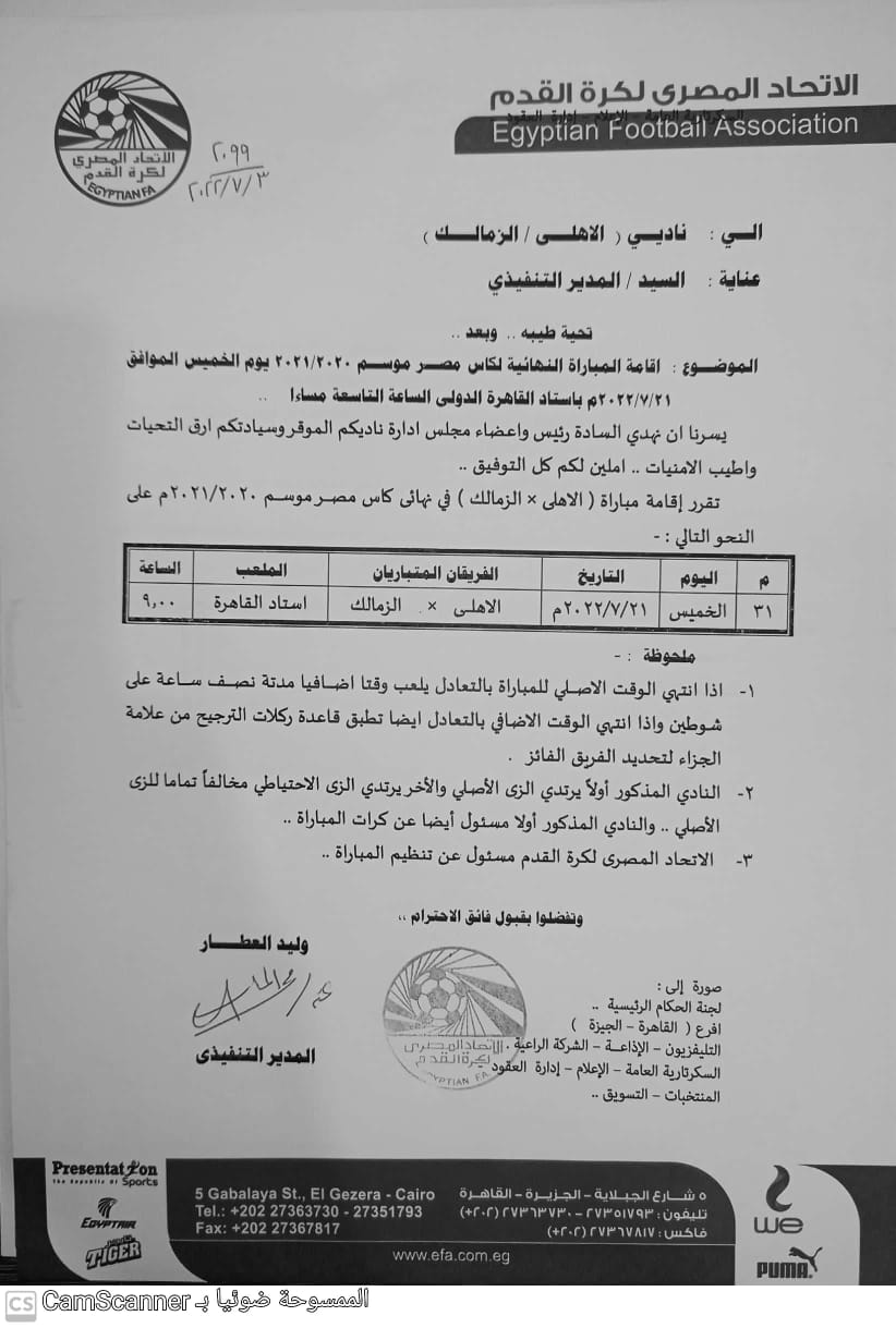 وأرسل اتحاد الكرة اليوم خطابين إلى ناديي الأهلي والزمالك يخطرهما بإقامة مباراة نهائي كأس مصر في التاسعة مساء يوم 21 يوليو الجاري باستاد القاهرة.