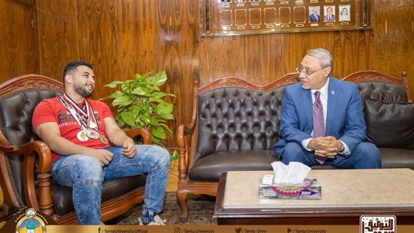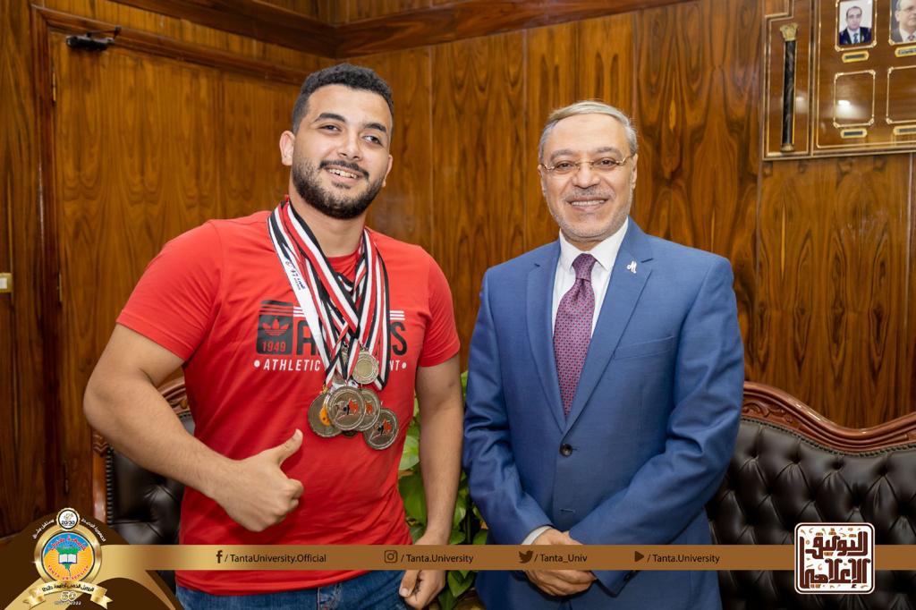 رئيس جامعة طنطا يكرم طالبا من ذوي الهمم حقق بطولات عالمية في رفع الأثقال