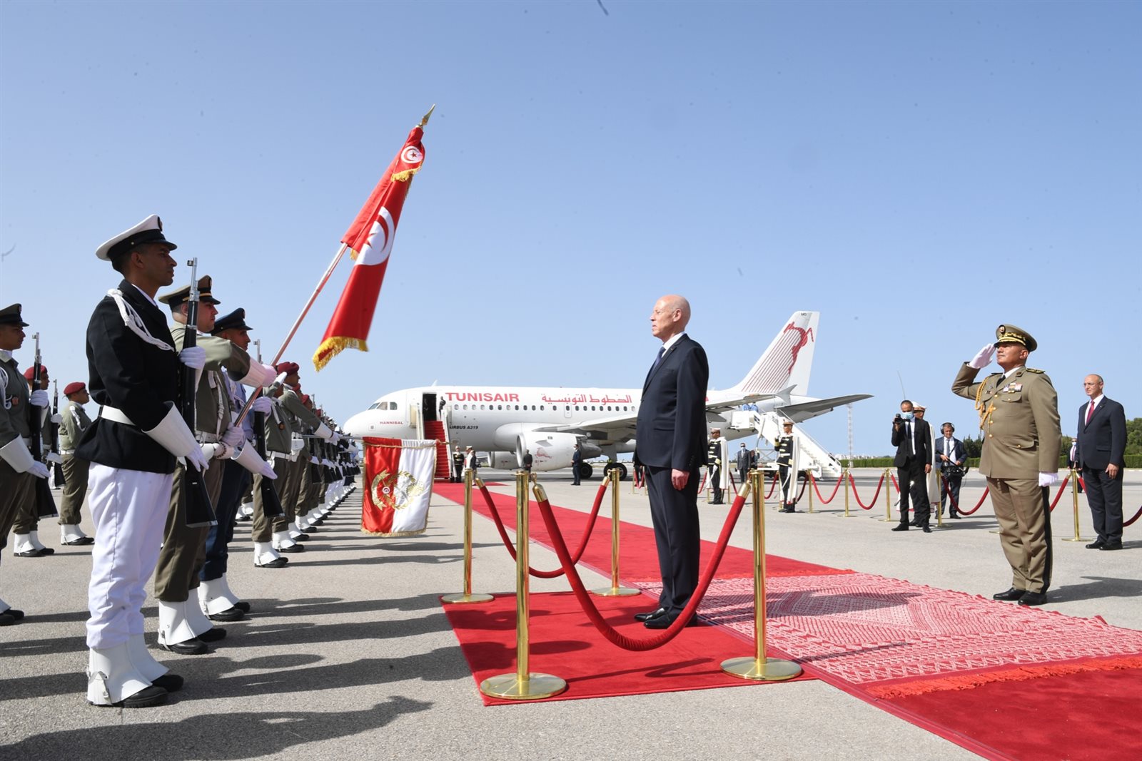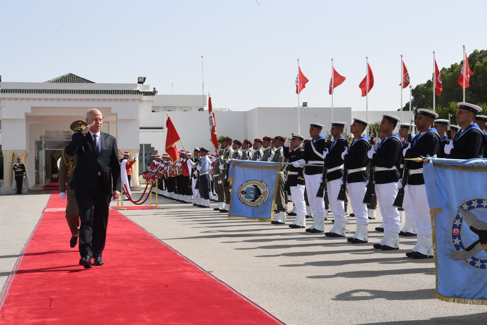 وعند وصول الرئيس التونسي لـ المطار الرئاسي، استعرض رئيس الجمهورية التونسية تشكيلة من الجيوش الثلاثة أدت له التحية، قبل تحية العلم على أنغام النشيد الوطني.