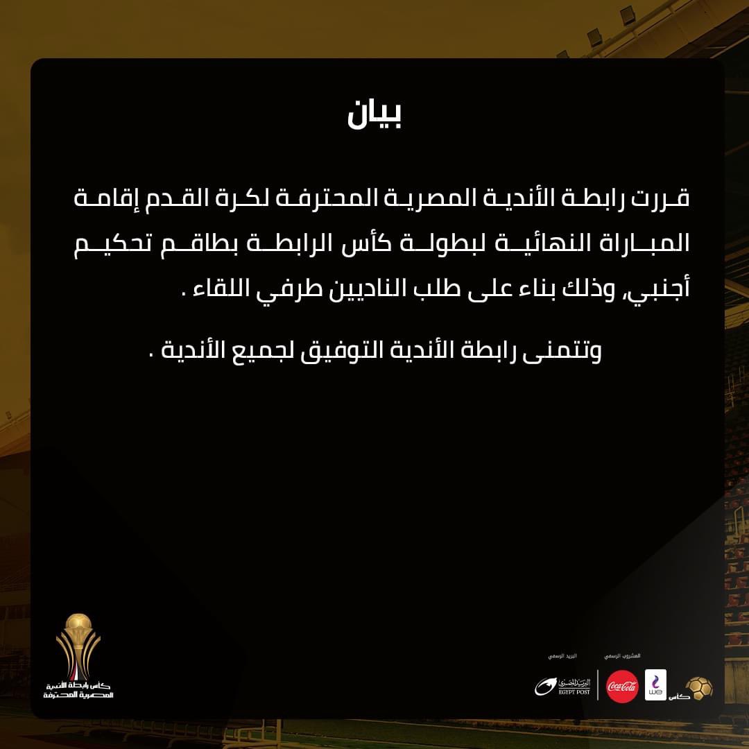 وأعلنت رابطة الأندية في بيان رسمي، أن قرار استقدام حكام أجانب لإدارة نهائي كأس الرابطة جاء بناء على رغبة طرفي النهائي فريقي غزل المحلة وفيوتشر.