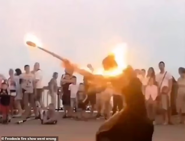 أصيب راقص بحروق شديدة في فمه ووجهه، بعد أن قام بخطأ خلال تأديته رقصة استعراضية أمام عشرات السياح في شبه جزيرة القرم، وفقًا لـ صحيفة ديلي ميل البريطانية.