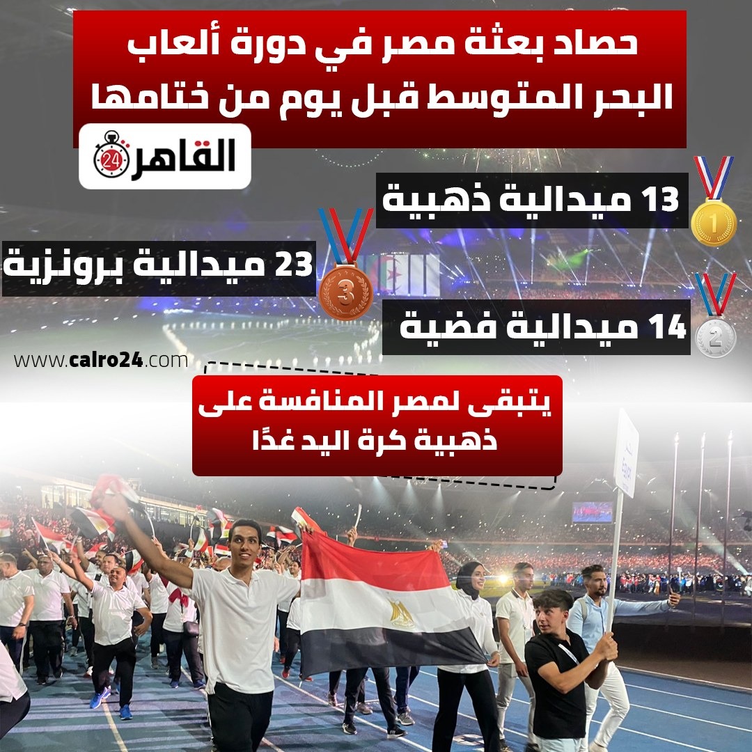 وتنتظر البعثة المصرية مساء اليوم الأربعاء، الميدالية رقم 51، أذ يلتقي منتخب مصر لكرة اليد مع نظيره منتخب إسبانيا، من اجل أخر الميداليات بهذه النسخة، وميدالية ذهبية ثانية على مستوى منافسات لعبة اليد بمختلف دورات البحر المتوسط منذ انطلاقها.