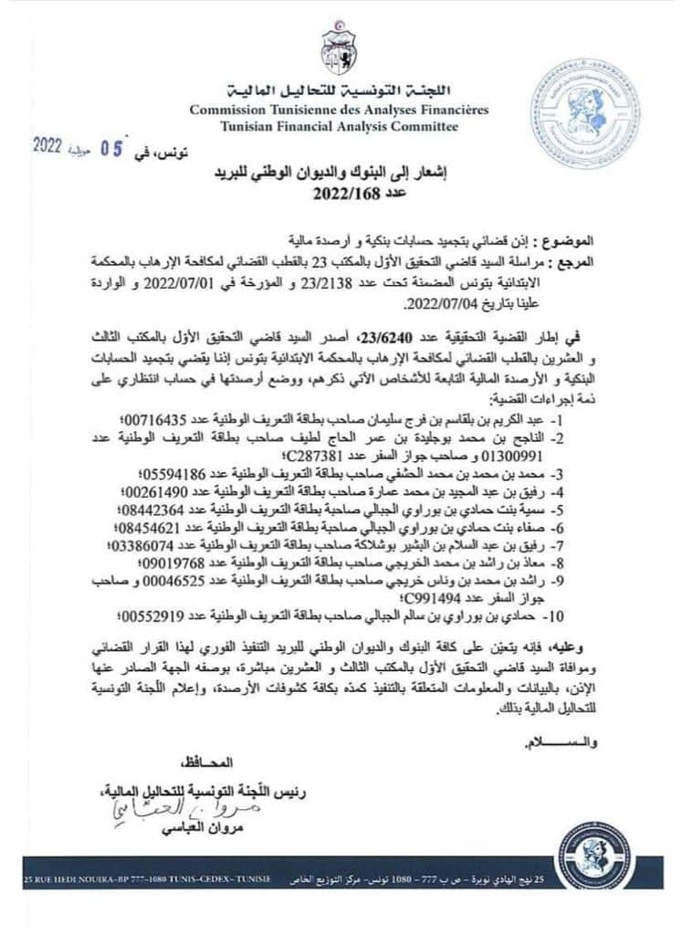 وورد في نص الخطاب أن قاضي التحقيق الأول بمكتب الثالث والعشرين بالقطب القضائي لمكافحة الإرهاب بالمحكمة الابتدائية بتونس، أصدر إذنا يقضي بتجميد الحسابات البنكية والأرصدة المالية التابعة للأشخاص الآتي ذكرهم ووصع أرصدتها في حساب انتظاري على ذمة القصية.