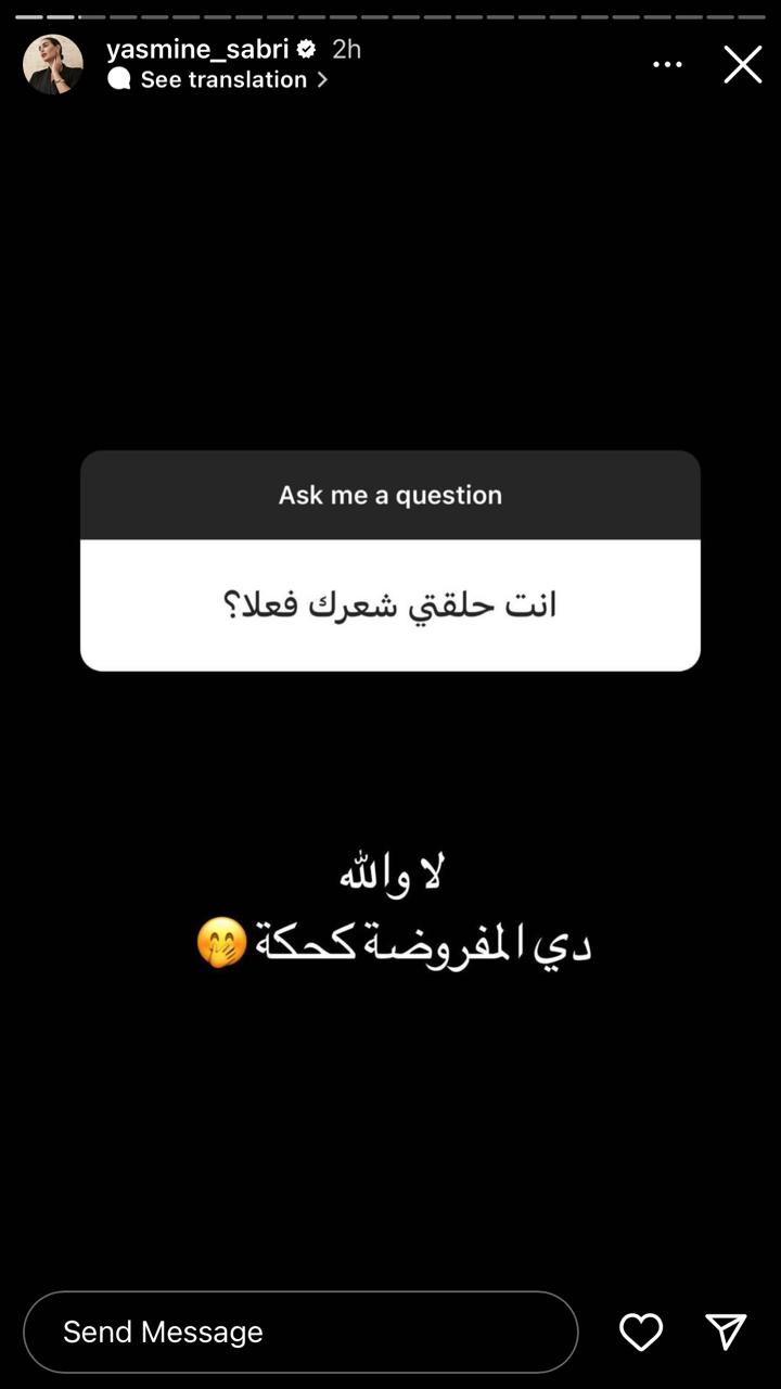 وردت ياسمين صبري، على سؤال أحد المتابعين لحسابها على إنستجرام، بشأن حلقها لشعرها، قائلة: لأ.. دي المفروض كحكة.