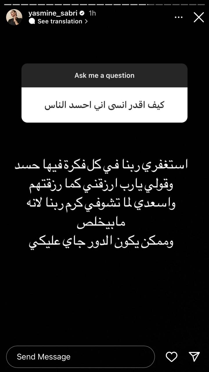 كما تطرقت ياسمين صبري للحديث عن الحسد، حيث وجهت لها إحدى المتابعات سؤالا حول كيفية منع نفسها من حسد الآخرين أو النظر لهم، قائلة: استغفري ربنا في كل فكرة فيها حسد، وقولي يا رب ارزقني كما رزقتهم، وافرحي لما تشوفي كرم ربنا، لأنه مش بيخلص، ويمكن الدور جاي عليكي.