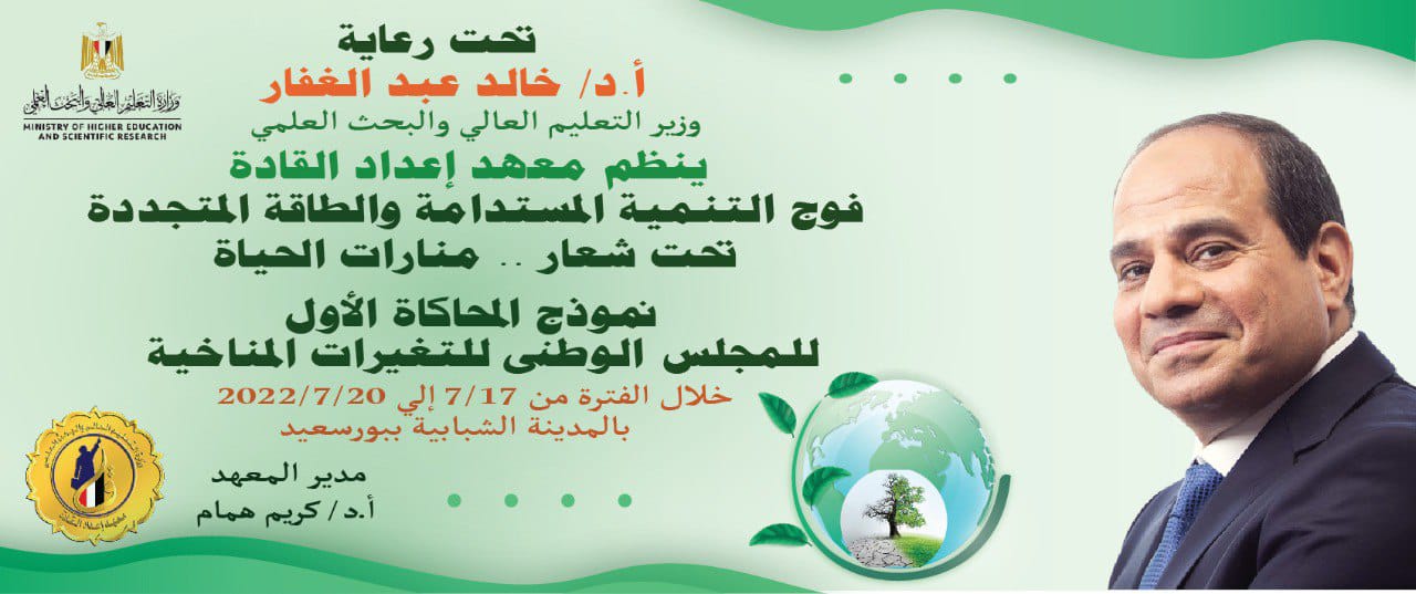 ينظم معهد إعداد القادة تحت رعاية الدكتور خالد عبد الغفار وزير التعليم العالي والبحث العلمي، وبقيادة الدكتور كريم همام مدير المعهد، فوج التنمية المستدامة والطاقة المتجددة والذي يقام تحت شعار: منارات الحياة، وتنظيم نموذج المحاكاة الأول للمجلس الوطني للتغييرات المناخية وذلك بمقر المدينة الشبابية ببورسعيد.