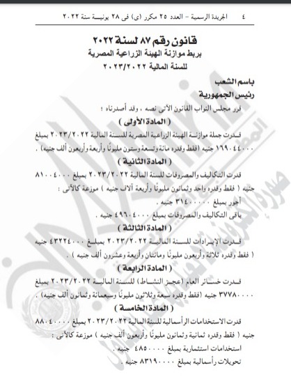 قانون رقم 87 لسنة 2022 بربط موازنة الهيئة الزراعية المصرية للسنة المالية 2022/2023.