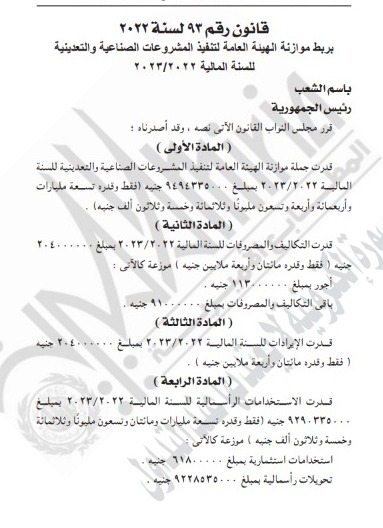 قانون رقم 93 لسنة 2022 بربط موازنة الهيئة العامة لتنفيذ المشروعات الصناعية والتعدينية للسنة المالية 2022/2023.