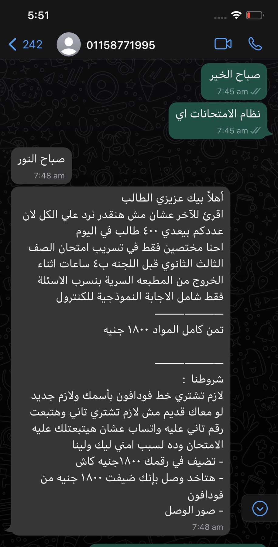 وتتبع القاهرة 24، الرقم المتداول عبر صفحات مواقع التواصل الاجتماعي، حيث أرسلنا رسالة للرقم المكتوب عبر تطبيق واتس آب نسأل فيها عن الامتحانات، ليرد قائلًا: إحنا متخصصين فقط في تسريب امتحان الصف الثالث الثانوي قبل اللجنة بـ 4 ساعات أثناء الخروج من المطبعة السرية بنسرب الاسئلة فقط شامل الإجابة النموذجية للكنترول، وسعر المواد كافة 1800 جنيه، و700 جنيه للمادة الواحدة.