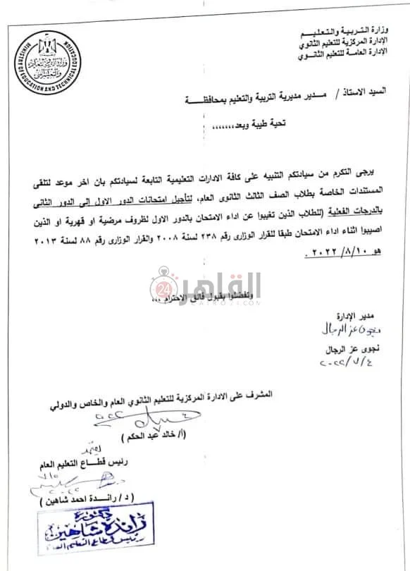 على صعيد آخر، وجهت وزارة التربية والتعليم والتعليم الفني، خطابًا، إلى جميع مديريات التربية والتعليم بجميع المحافظات، بشأن طلاب الثانوية العامة 2022، الذين تقدموا بطلب تأجيل امتحانات الدور الأول، إلى الدور الثاني، بنفس الدرجة الفعلية؛ لظروف مرضية أو قهرية، أو لإصابتهم في أثناء أداء امتحان الدور الأول.