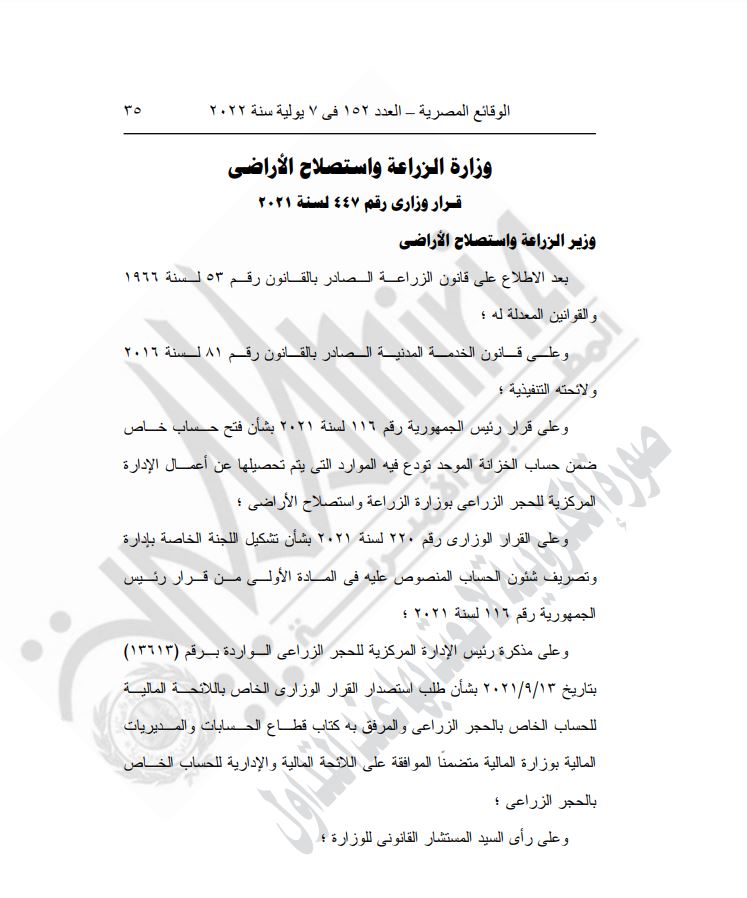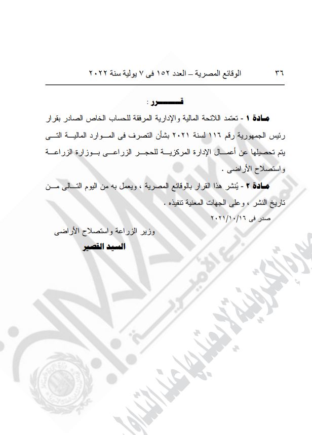 وأكدت الوقائع، اعتماد اللائحة المالية والإدارية المرفقة للحساب الخاص الصادر بقرار رئيس الجمهورية رقم 116 لسنة 2021 بشأن التصرف في المـوارد الماليـة التـي يتم تحصيلها عن أعمـال الإدارة المركزيـة للحجر الزراعـي بـوزارة الزراعـة واستصلاح الأراضي.