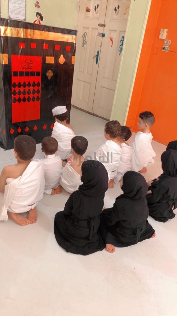 وقامت معلمات الحضانة، بشرح أركان مناسك الحج للأطفال من خلال نماذج مجسمة لشكل الكعبة، لتقريب الصورة للأطفال ليعيشوا مناسك الحج بشكل يتذكرونه في أذهانهم.