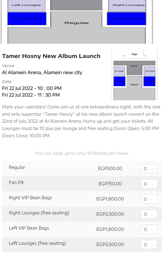 ولكن لم تتغير أسعار تذاكر الحفل منذ العام الماضي، حيث أن موقع تيكتس مارشيه كان مسئولًا عن حجز التذاكر، وتنوعت الأسعار ما بين 4 فئات، الأولى Gold بـ 500 جنيه، والثانية Platinum بـ 850 جنيه، وتكون فئة VIP بـ 1750 و3500 جنيه.