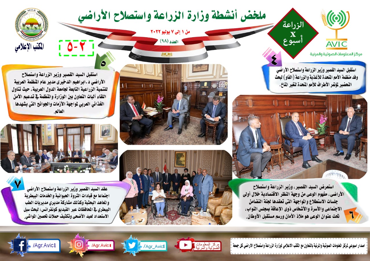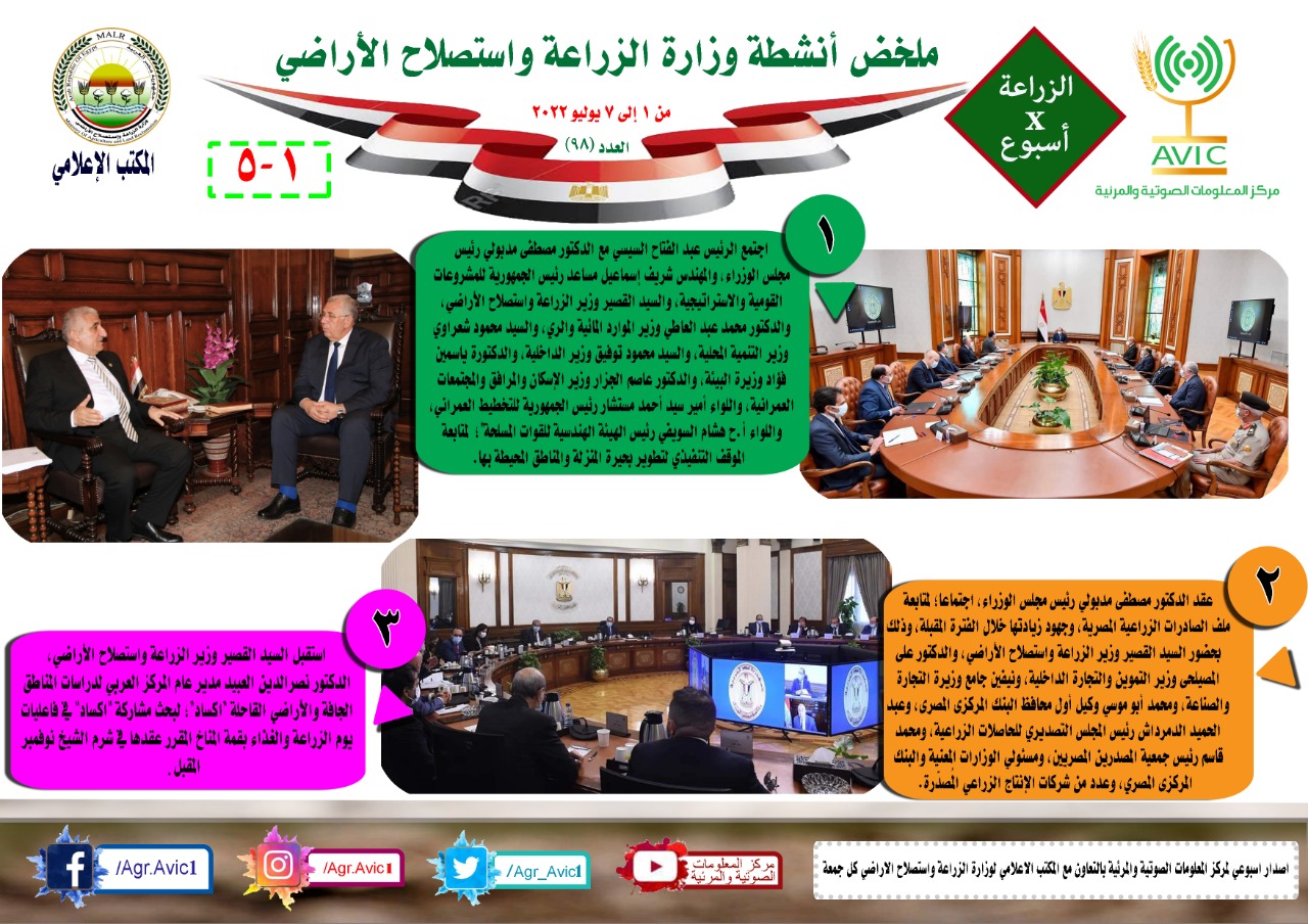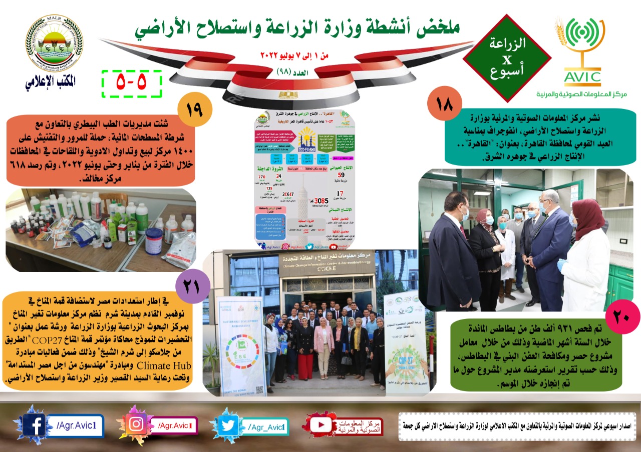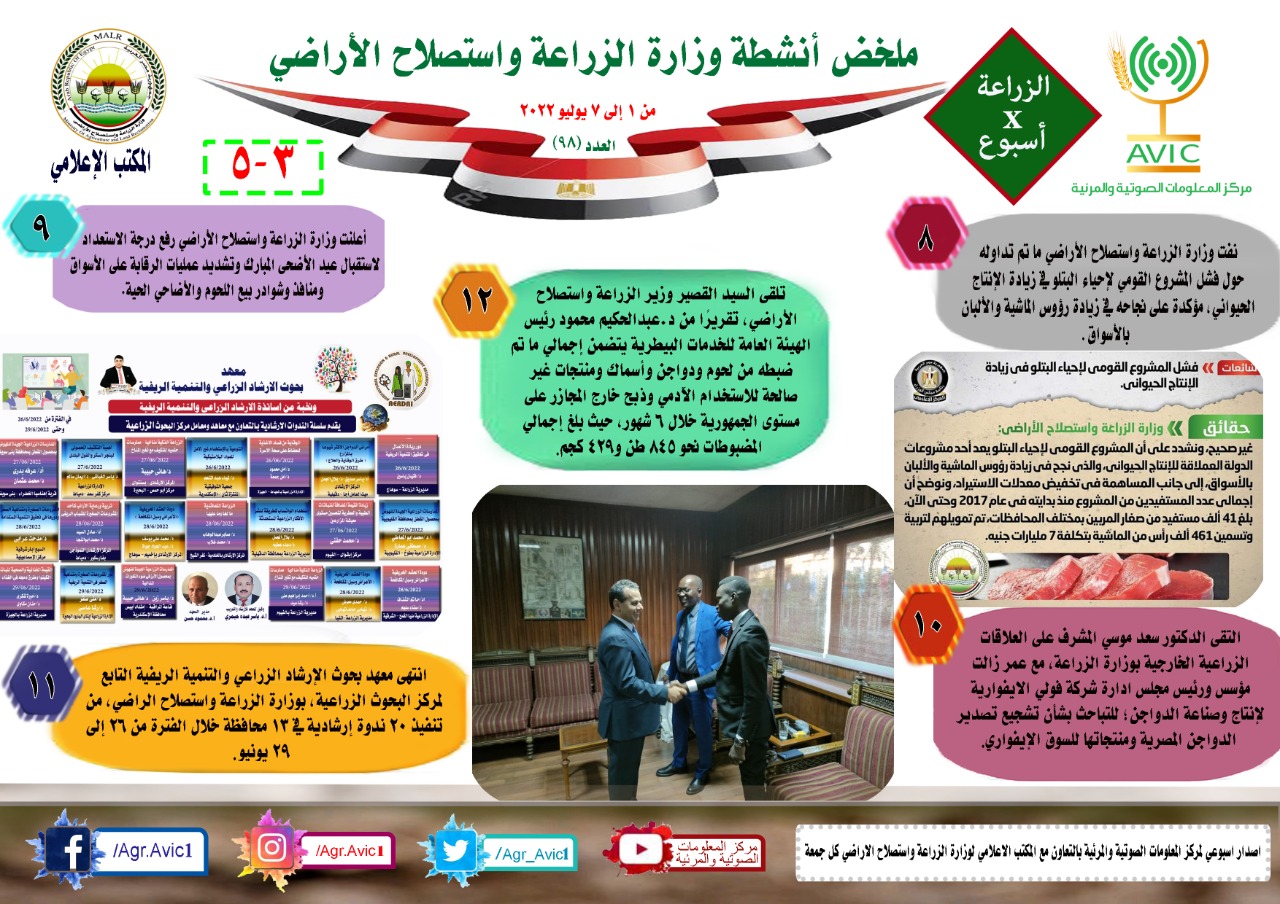 أصدر مركز المعلومات الصوتية والمرئية، التابع لوزارة الزراعة واستصلاح الأراضي، الانفوجراف الأسبوعي في نسخته رقم 98، حول الحصاد الأسبوعي لأهم أنشطة الوزارة، خلال الأسبوع الماضي في الفترة من 1 وحتى 7 يوليو الجاري، وذلك بالتعاون مع المكتب الإعلامي للوزارة.