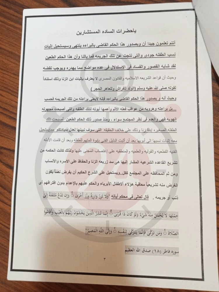 وحيث أثبت الدليل الفني بأبوة المتهم للطفلة وبعد أن قامت الأدلة الفنية القطعية والقولية والعلمية والمنطقية على اغتصاب المجنى عليها ولذلك كانت الحكمة من تشريع القاعدة الشرعية المشار إليها هي سد ذريعة الزنا والحفاظ على الأسرة والأنساب ومن ثم المحافظة على المجتمع ككل.. ويستحيل على الشرع الحكيم أن يفرض نصا يكون الغرض منه تشريعية معاقبة هؤلاء الأطفال الأبرياء والحكم عليهم بالإعدام بدون اقترافهم أي ذنب أو جريمة، قال تعالى في محكم أبياته "ولا تزر وازرة وزر أخرى".
