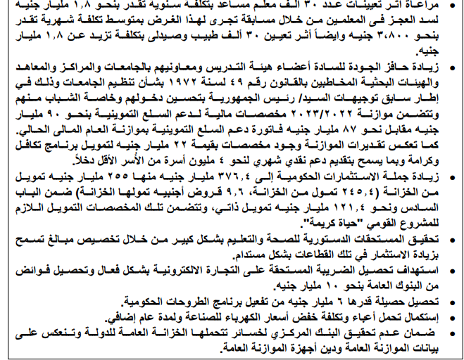 وكشف البيان المالي الجديد، أن ذلك جاء في إطار توجيهات الرئيس عبد الفتاح السيسي، بتحسين دخـول أعضاء هيئـة التدريس ومعاونيهم بالجامعات والمراكز والمعاهد والهيئات البحثية وخاصـة الشـباب مـنهم، فضًلا عن وجود تعيينات جديدة، لسد العجـز فـي المعلمين مـن خـلال مسابقة تجـرى لهذا الغرض بمتوسـط تكلفـة شهرية تقـدر بنحو 3.800 جنيه وأيضًا أثـر تعيين 30 ألـف طبيب وصيدلي بتكلفة تزيد عن 1.8 مليـار جنيه.