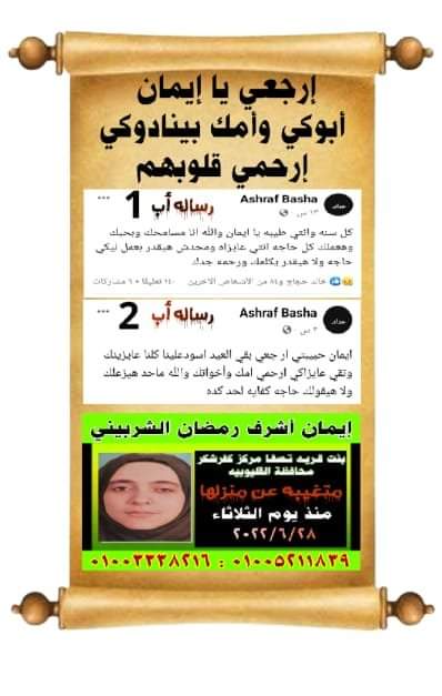وجه أشرف الشربيني، والد فتاة كفر شكر بمحافظة القليوبية، المتغيبة عن منزلها منذ عدة أيام رسالة لها عبر فيس بوك، قائلا: ارجعي يا إيمان كلنا بنحبك، العيد وحش من غيرك محدش يقدر يعملك حاجة ورحمة جدك.