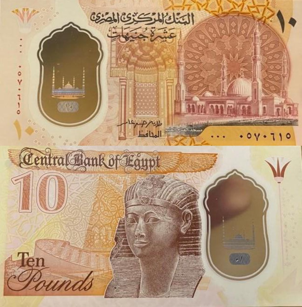 وفي أحدث إصدار لـ العملات تأتي العشرة جنيهات البلاستيكية الجديدة لجمع بين تمثال حتشبسوت والهرم ومكتبة الإسكندرية، ومسجد الفتاح العليم، ومصمم العشرة البلاستيكية هو المكتب الإنجليزي العالمي ديلارو، والذي صمم كل عملات بريطانيا وأستراليا، وأغلب العملات البلاستيكية في العالم، ما يقرب من 77 عملة على مستوى العالم.
