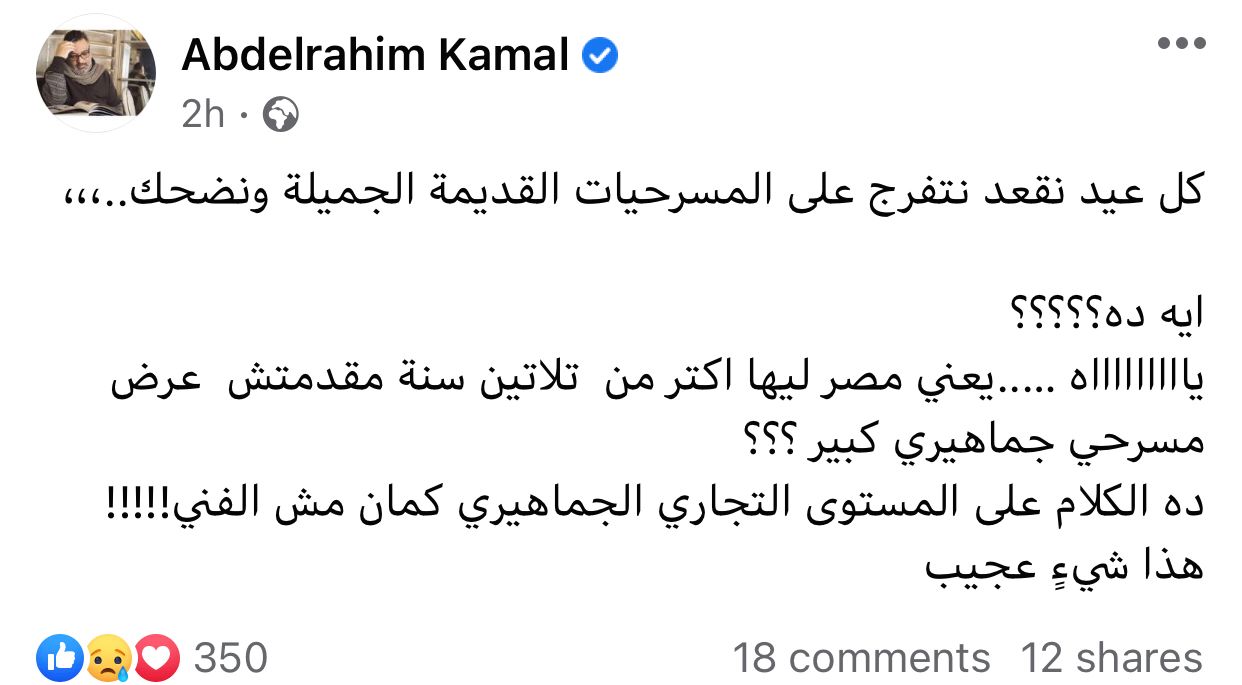 في المقابل، لم يكشف عبد الرحيم كمال؛ حقيقة هذا التصريح حتى الآن، ولم يعط للأمر أي أهمية، وكتب عبر حسابه الرسمي على فيسبوك منشورا جديدا حول قلة المسرحيات، قائلا: كل عيد نقعد نتفرج على المسرحيات القديمة الجميلة ونضحك.. يعني مصر بقالها أكثر من 30 سنة مقدمتش عرض مسرحي جماهيري كبير، والكلام دا كمان على المستوى الجماهيري والتجاري وليس الفني.. هذا شيء عجيب.