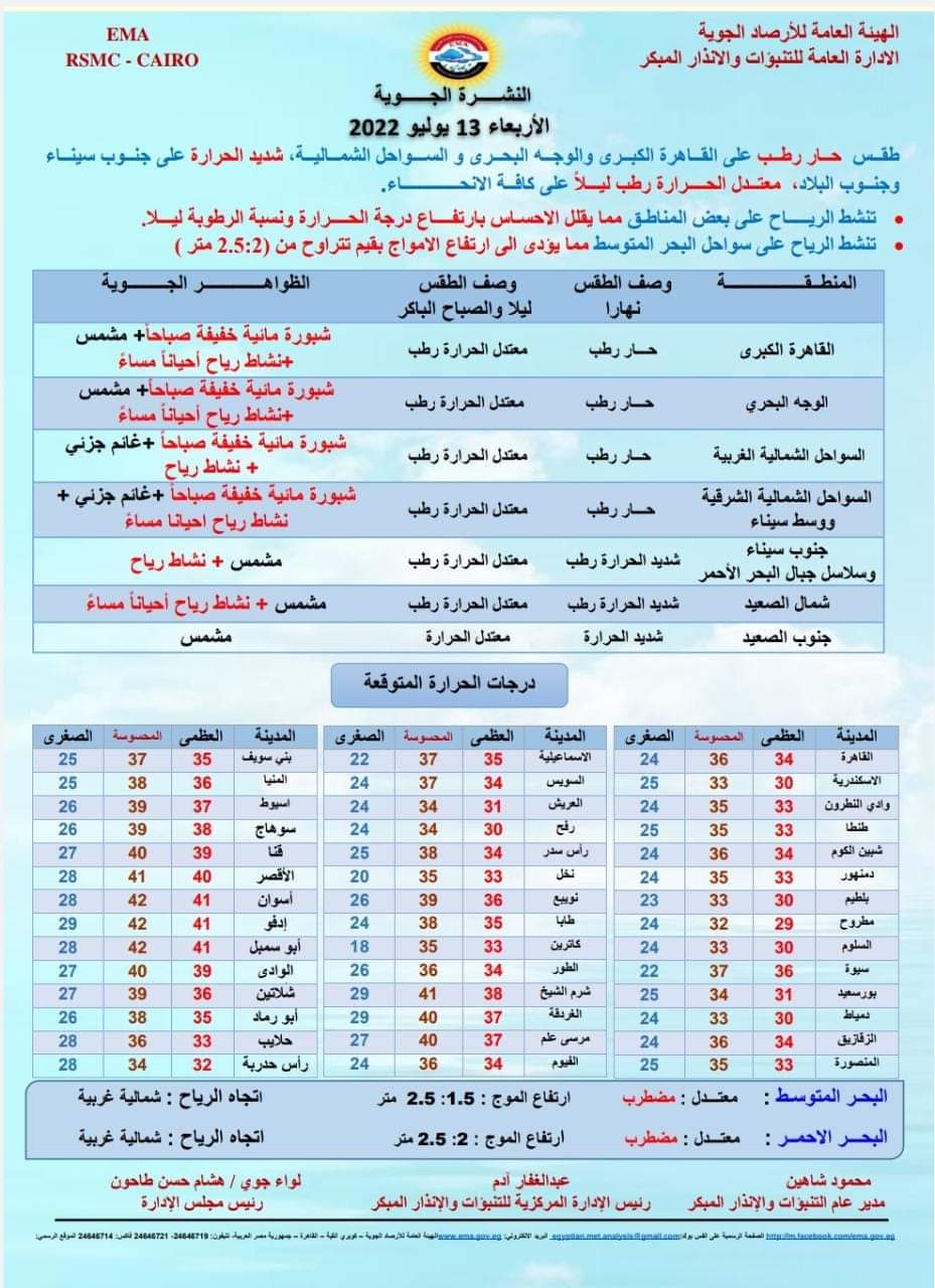 وتُسجل القاهرة الكبرى غدًا 34 درجة مئوية، وتشهد شبورة مائية خفيفة صباحًا وطقس مشمس، ونشاط رياح أحيانًا في المساء، وكذلك منطقة الوجه البحري، حسب البيان الرسمي للهيئة العامة للأرصاد.