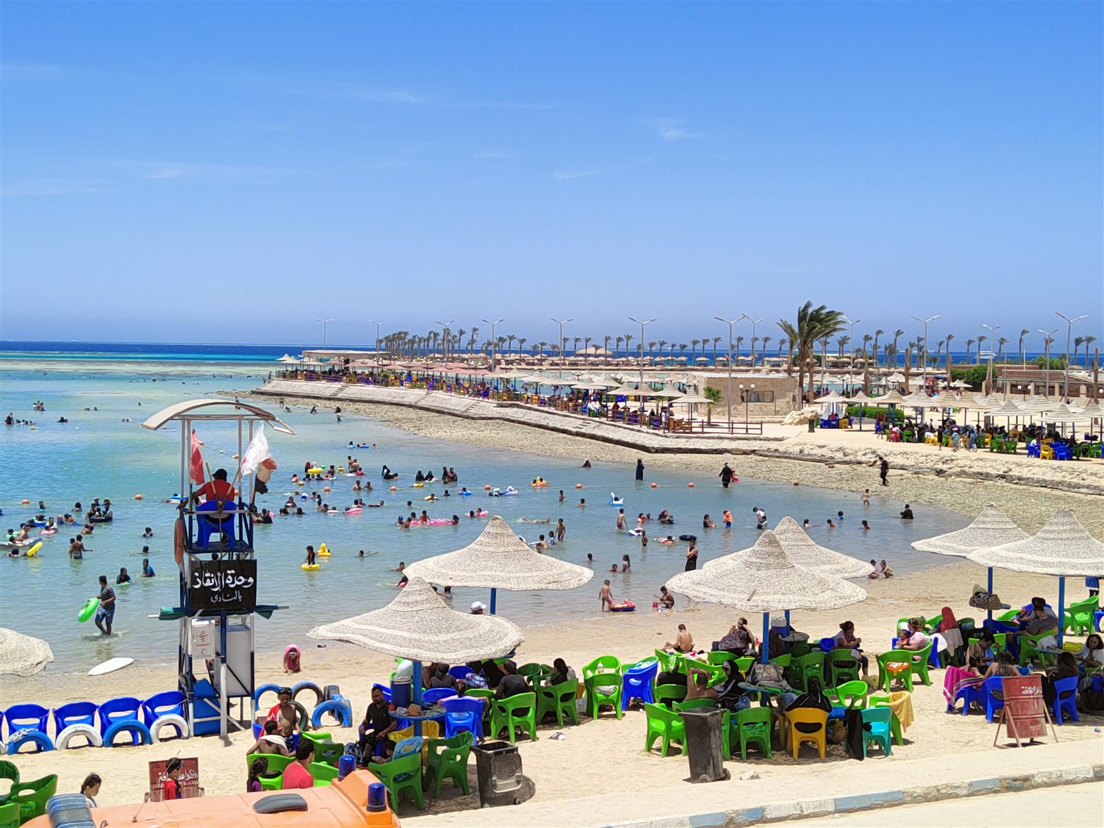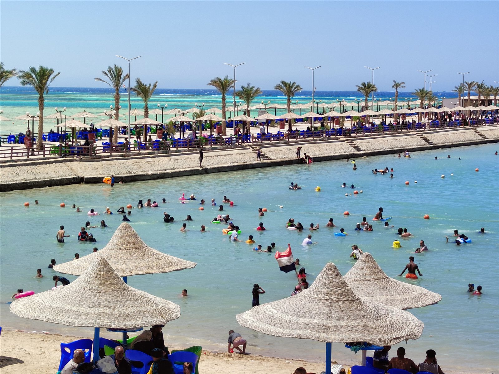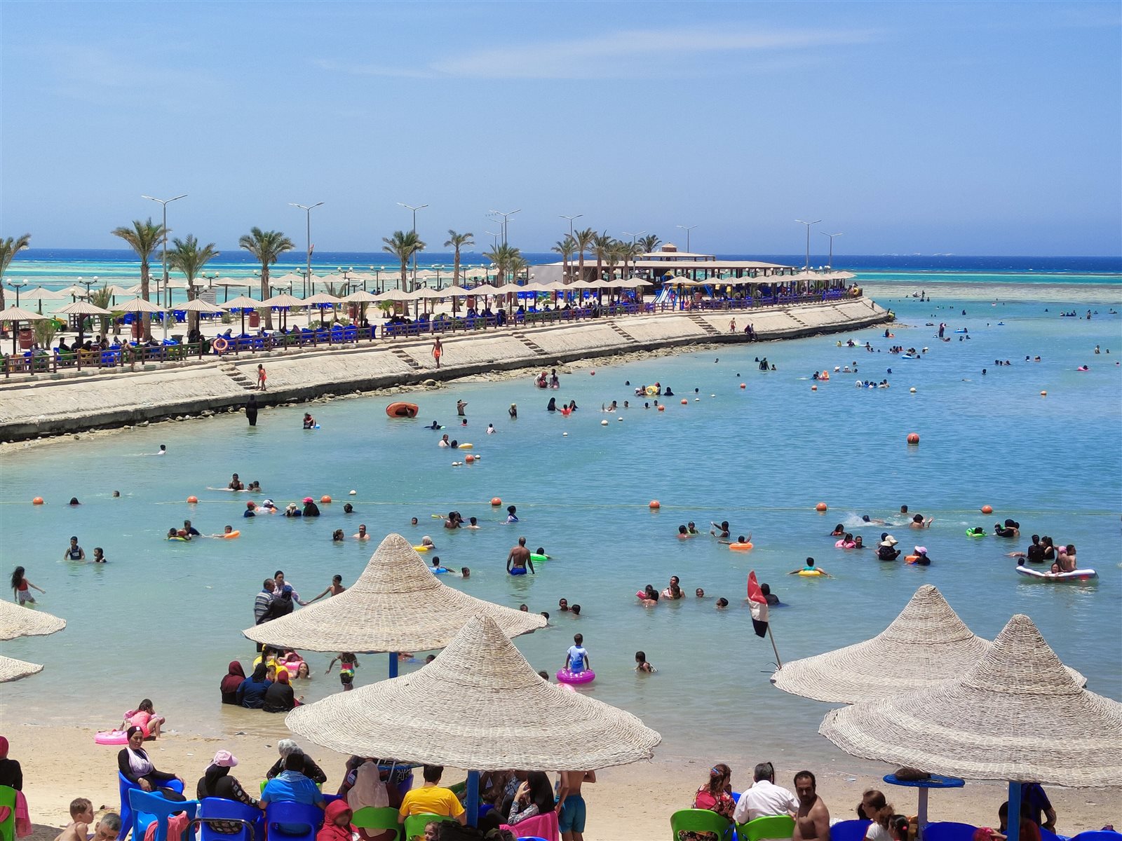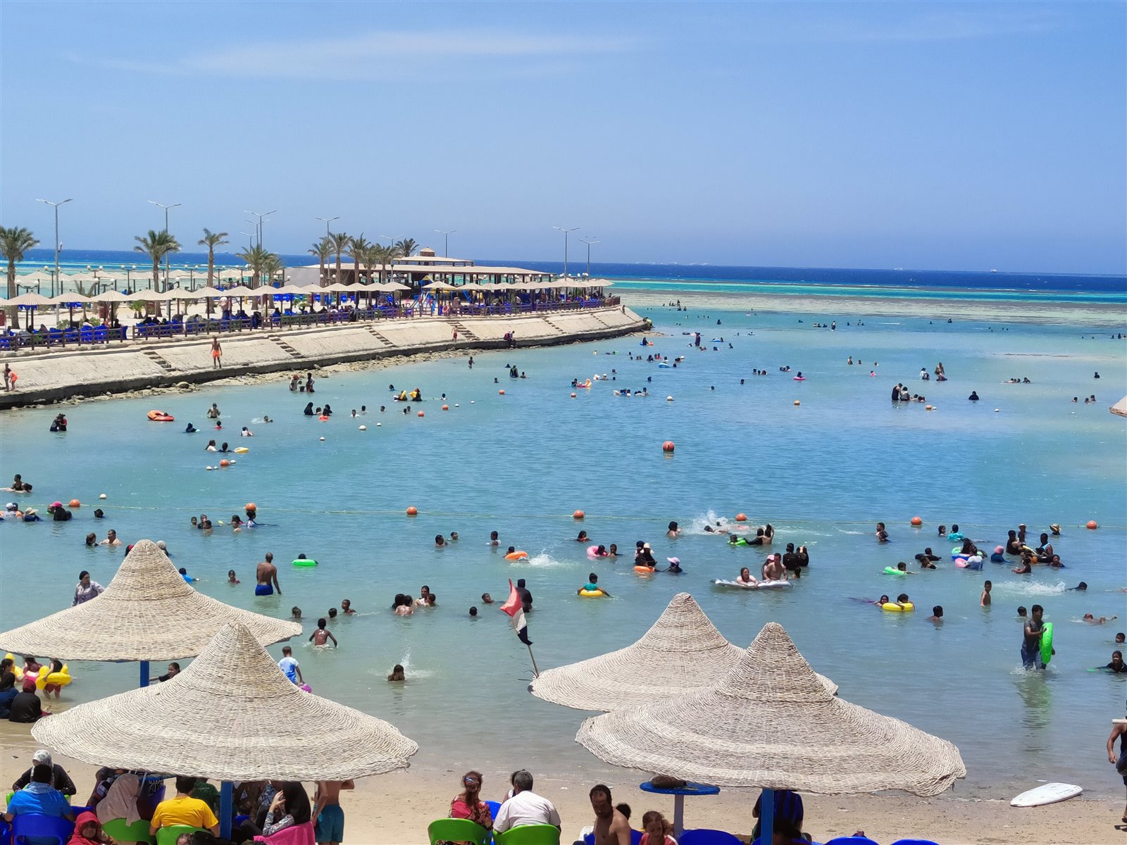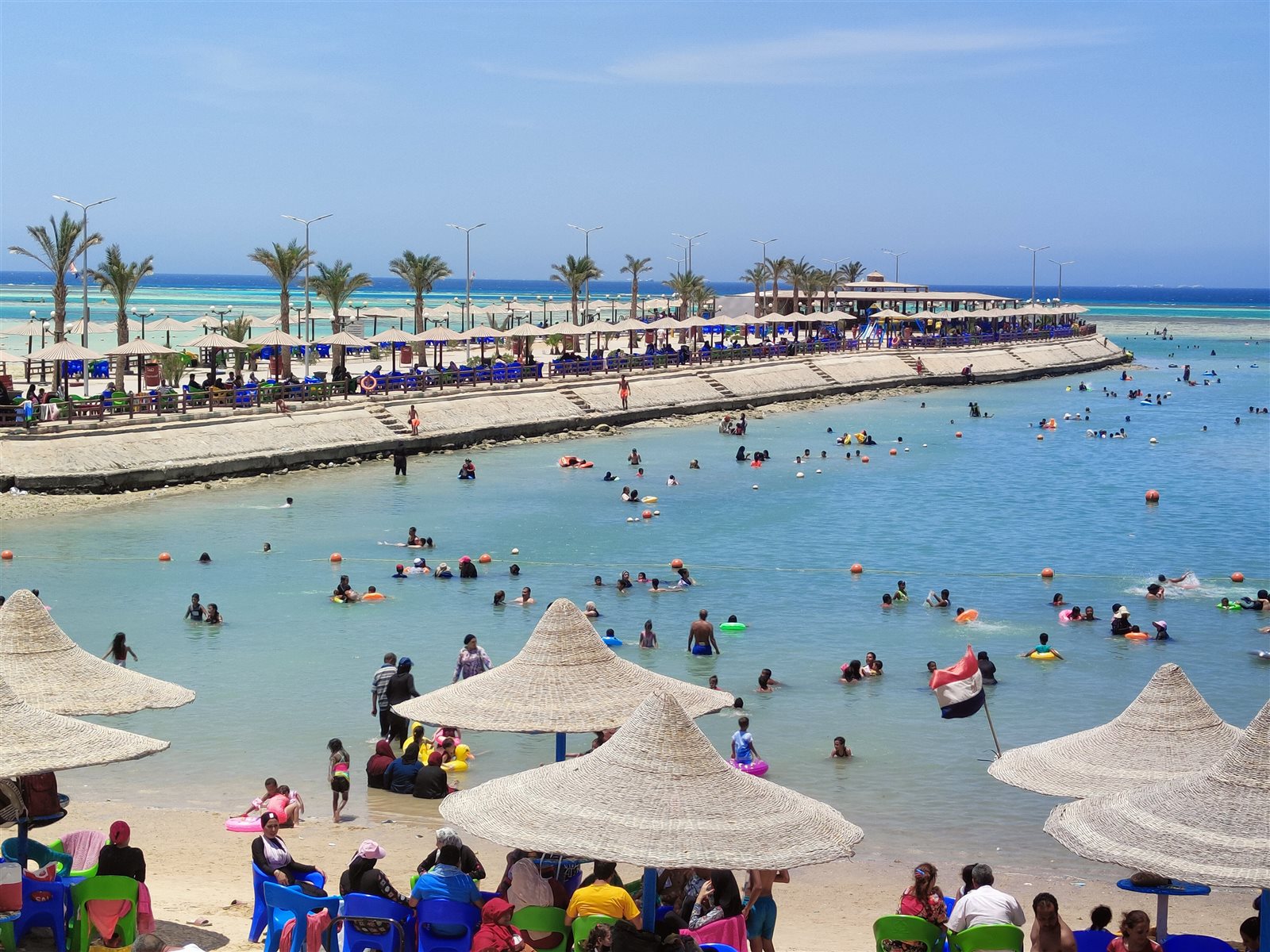 رغم تراجع مياه البحر بسبب الجزر.. إقبال كبير على شواطئ الغردقة