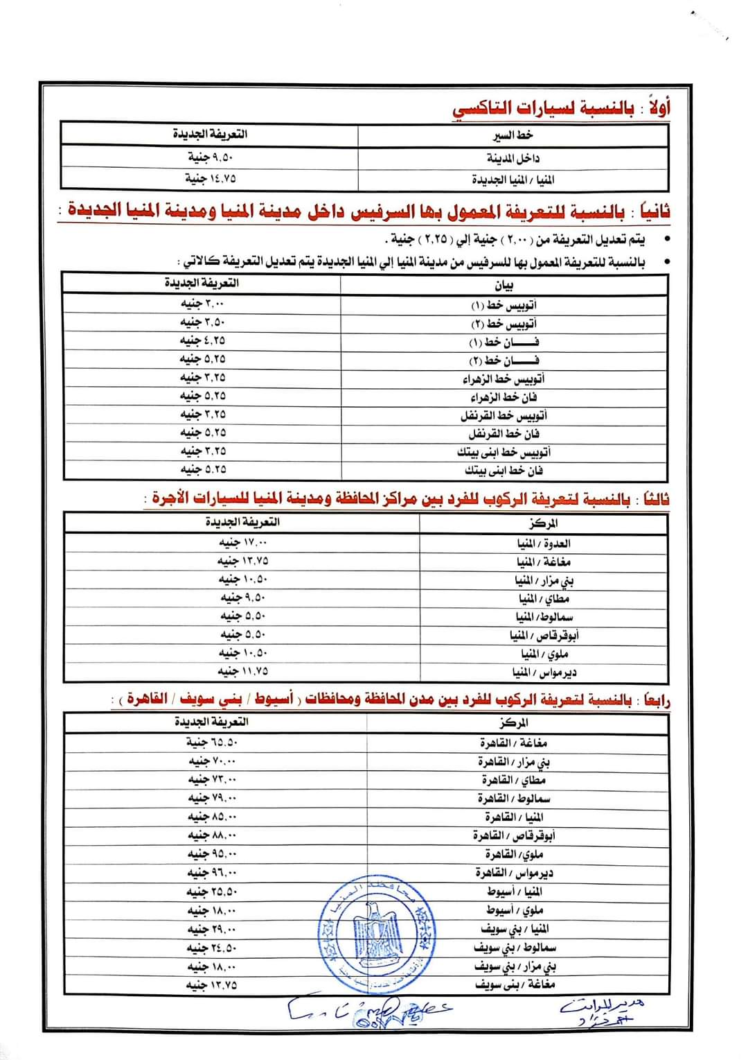 أسعار التعريفة الجديدة داخل محافظة المنيا