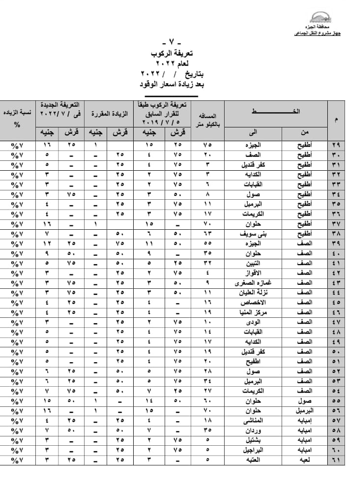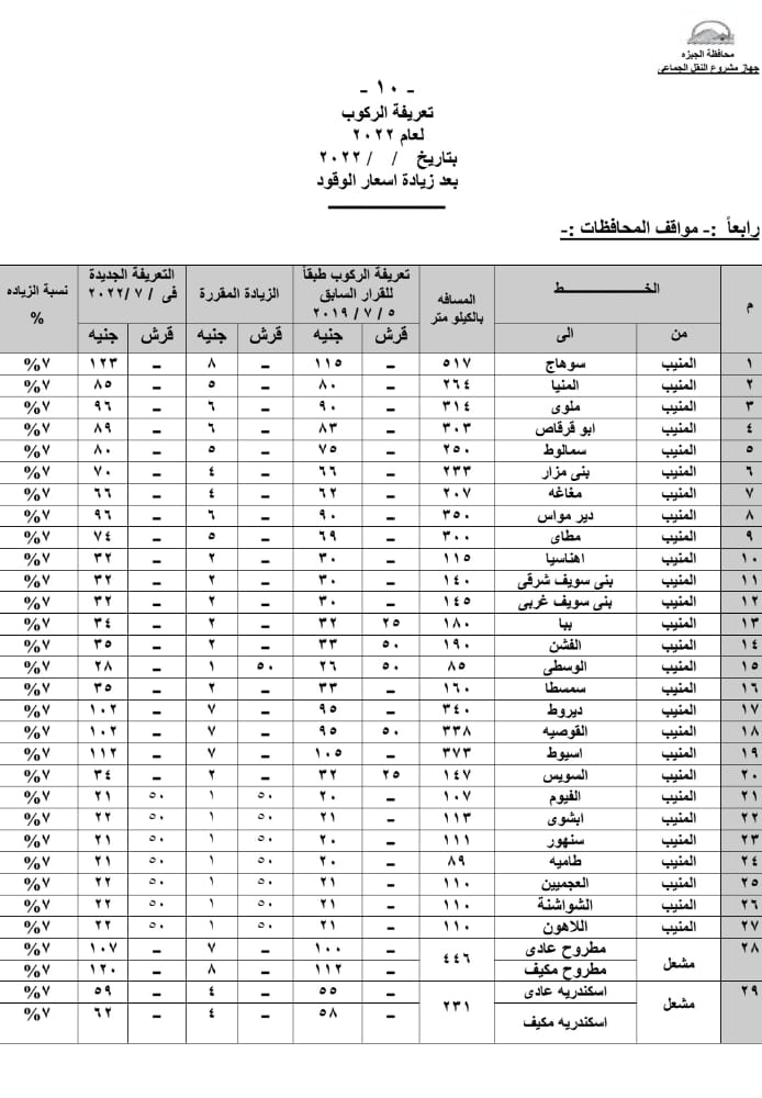 اعتماد تعريفة المواصلات الجديدة بالجيزة