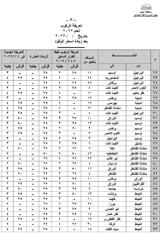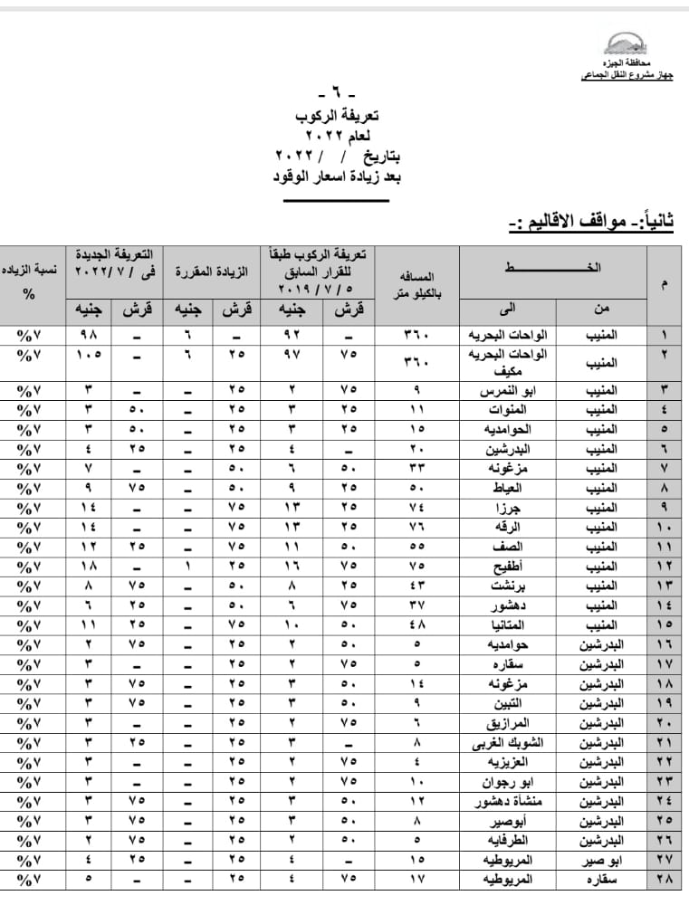 واعتمد اللواء أحمد راشد محافظ الجيزة، اليوم الأربعاء، تعريفة خطوط السير لسيارات النقل الجماعي والسرفيس الداخلية والأقاليم، وذلك في ضوء قرار لجنة التسعير التلقائي للمواد البترولية وتحريك أسعار المنتجات اعتبارًا من صباح اليوم.