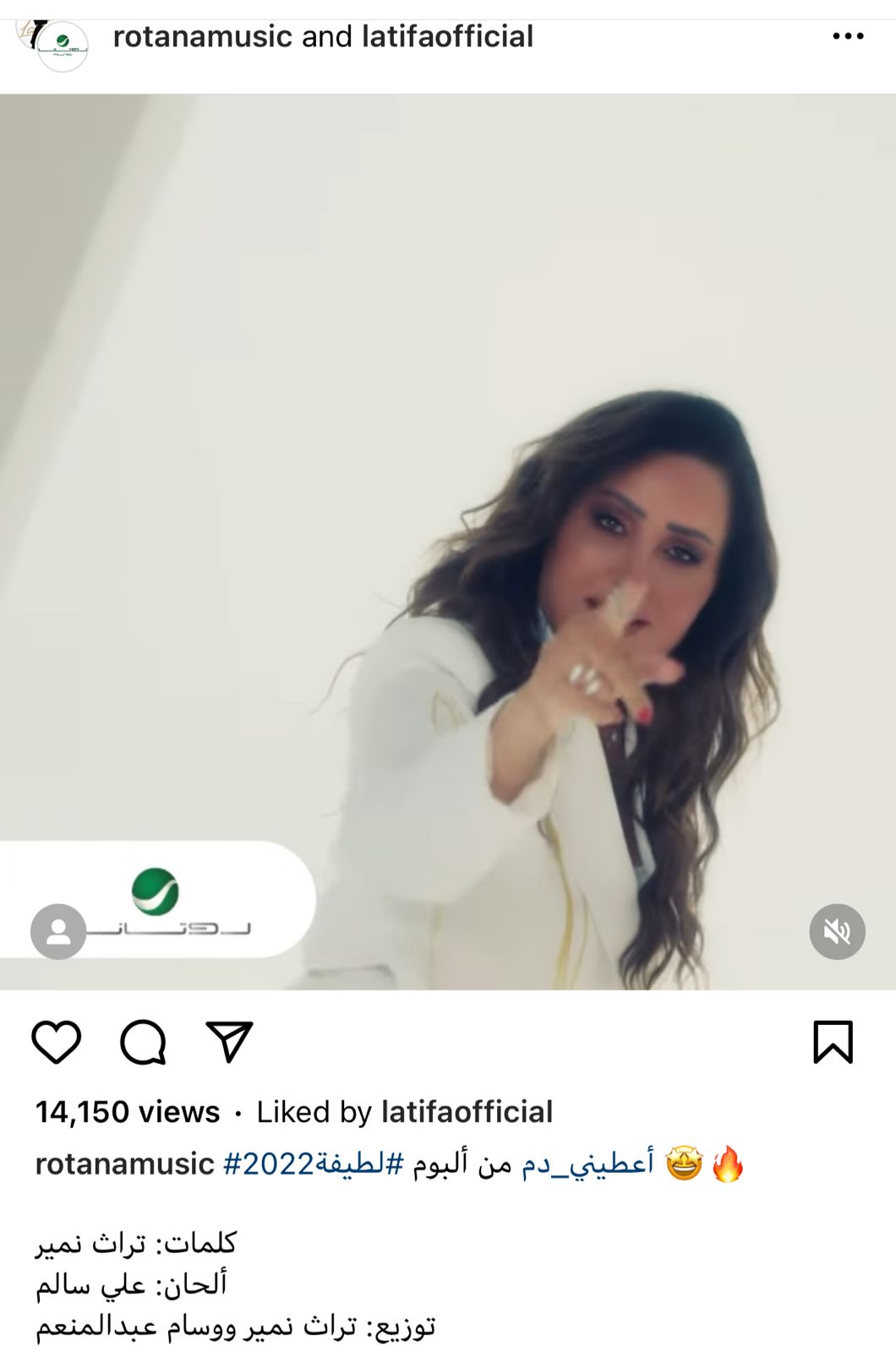 وشاركت لطيفة متابعيها بـ عدة مقاطع من أغانيها التي من المقرر طرحها في ألبومها الجديد، حيث نشرت مقطع من أغنيتها أعطيني دم، وذلك عبر حاسبها على موقع انستجرام، وعلقت قائلة: أغنية أعطيني دم من كلمات تراث نمير ومن ألحان علي سالم، ومن توزيع وسام عبد المنعم.. الخميس موعدنا.