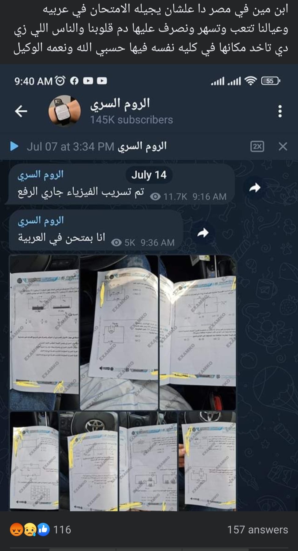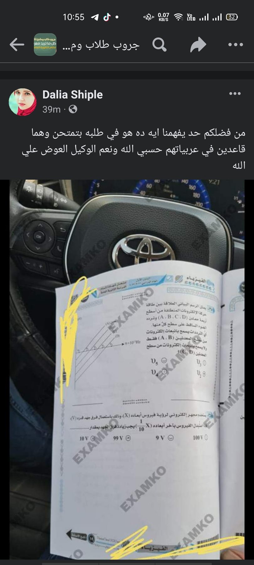 سادت حالة من الجدل على موقع التواصل الاجتماعي فيس بوك، في أثناء تداول امتحان الفيزياء لطلاب الثانوية العامة، على جروبات الغش عبر صفحات التليجرام، حيث ظهرت صورة لأجزاء من امتحان الفيزياء مصورة داخل سيارة خلال امتحان الطلاب داخل اللجان الامتحانية.
