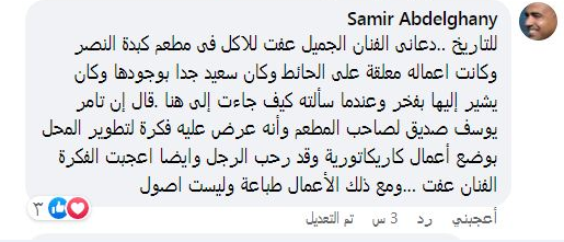 وأكمل سمير عبد الغني: للتاريخ.. دعانى الفنان الجميل عفت للأكل في مطعم كبدة النصر، وكانت أعماله معلقة على الحائط وكان سعيدا جدا بوجودها وكان يشير إليها بفخر وعندما سألته كيف جاءت إلى هنا، قال إن تامر يوسف صديق لصاحب المطعم، وأنه عرض عليه فكرة لتطوير المحل بوضع أعمال كاريكاتورية، وقد رحب الرجل وأيضا أعجبت الفكرة الفنان عفت.. ومع ذلك الأعمال طباعة وليست أصول.
