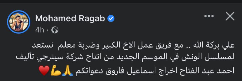 وكتب محمد رجب منشورًا عبر حسابه الشخصي بموقع التواصل الاجتماعي فيسبوك قائلا: على بركة الله.. مع فريق عمل الأخ الكبير وضربة معلم نستعد لمسلسل الونش في الموسم الجديد من إنتاج شركة سينرجي تأليف أحمد عبد الفتاح إخراج إسماعيل فاروق دعواتكم.