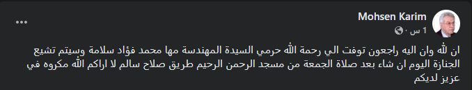 وكتب محسن كريم والد المنتجة دينا كريم منشورا ينعى فيه زوجته الراحلة، وذلك عبر حسابه بموقع التواصل الاجتماعي فيسبوك، إذ قال: إنا لله وإنا إليه راجعون توفيت إلى رحمة الله حرمي المهندسة مها محمد فؤاد سلامة، وسيتم تشيع الجنازة اليوم إن شاء الله بعد صلاة الجمعة من مسجد الرحمن الرحيم بطريق صلاح سالم.. لا أراكم الله مكروه في عزيز لديكم.