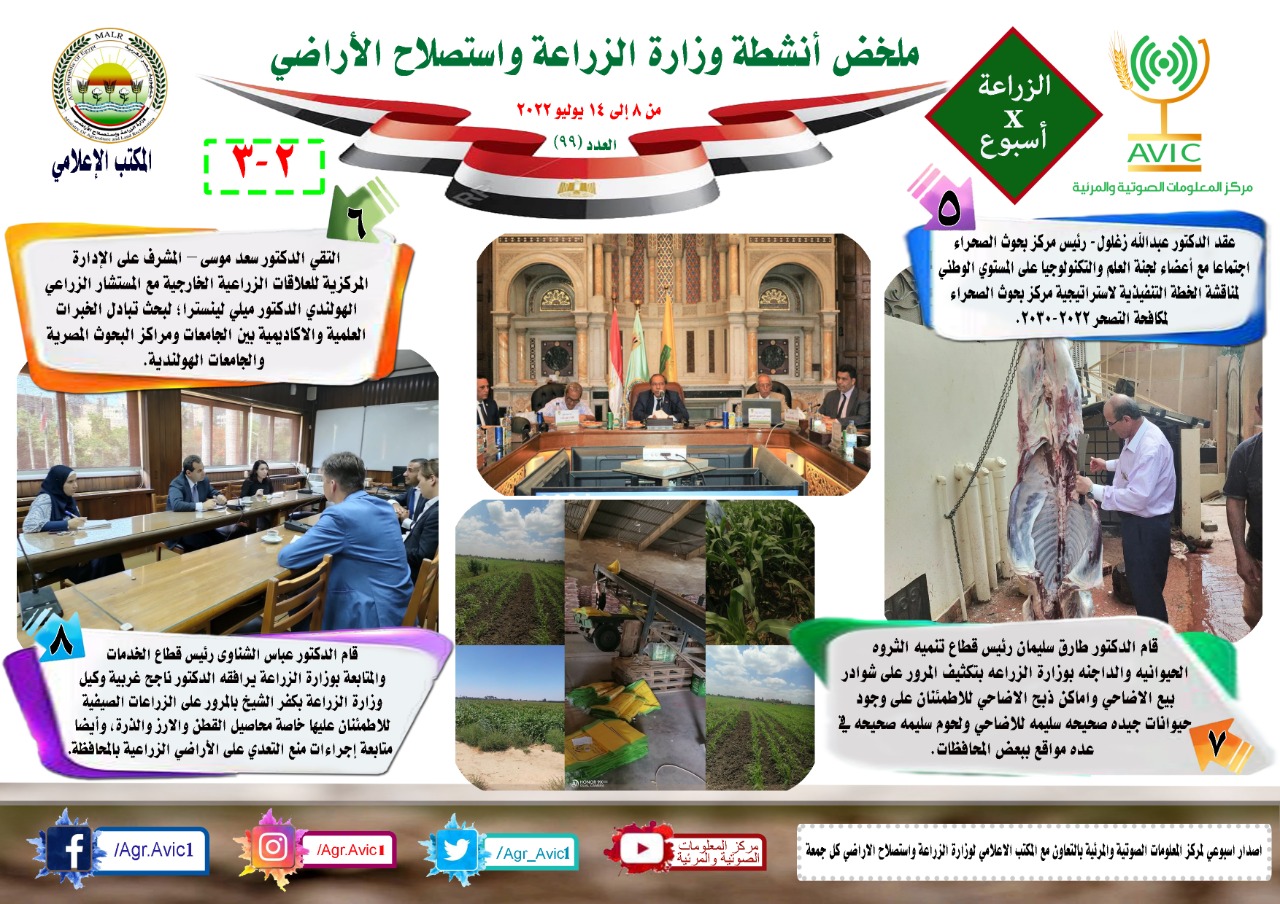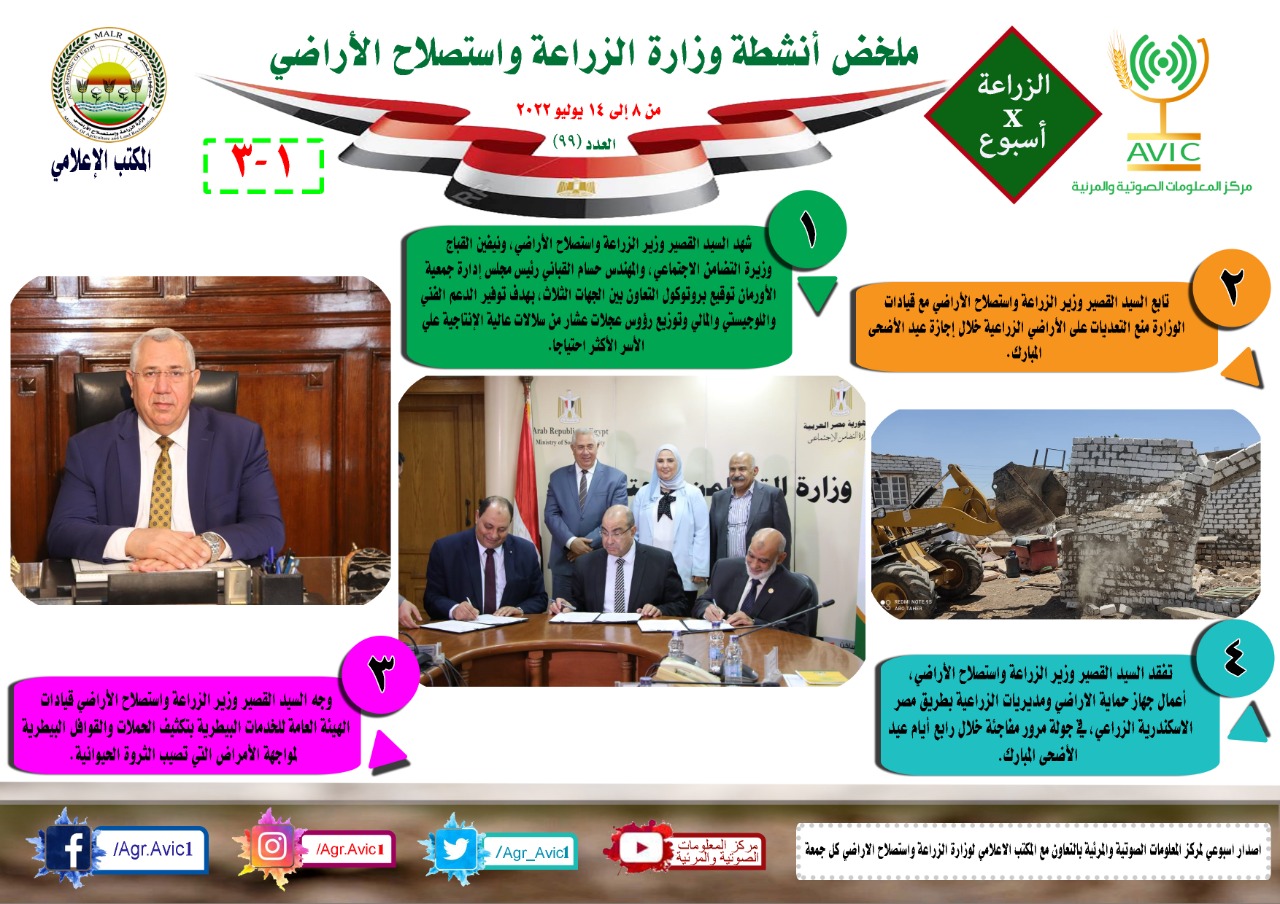 أصدر مركز المعلومات الصوتية والمرئية، التابع لوزارة الزراعة واستصلاح الأراضي، "الانفوجراف الأسبوعي" في نسخته رقم 99، حول الحصاد الأسبوعي لأهم أنشطة الوزارة، خلال الأسبوع الماضي في الفترة من 8 وحتى 14 يوليو الجاري.