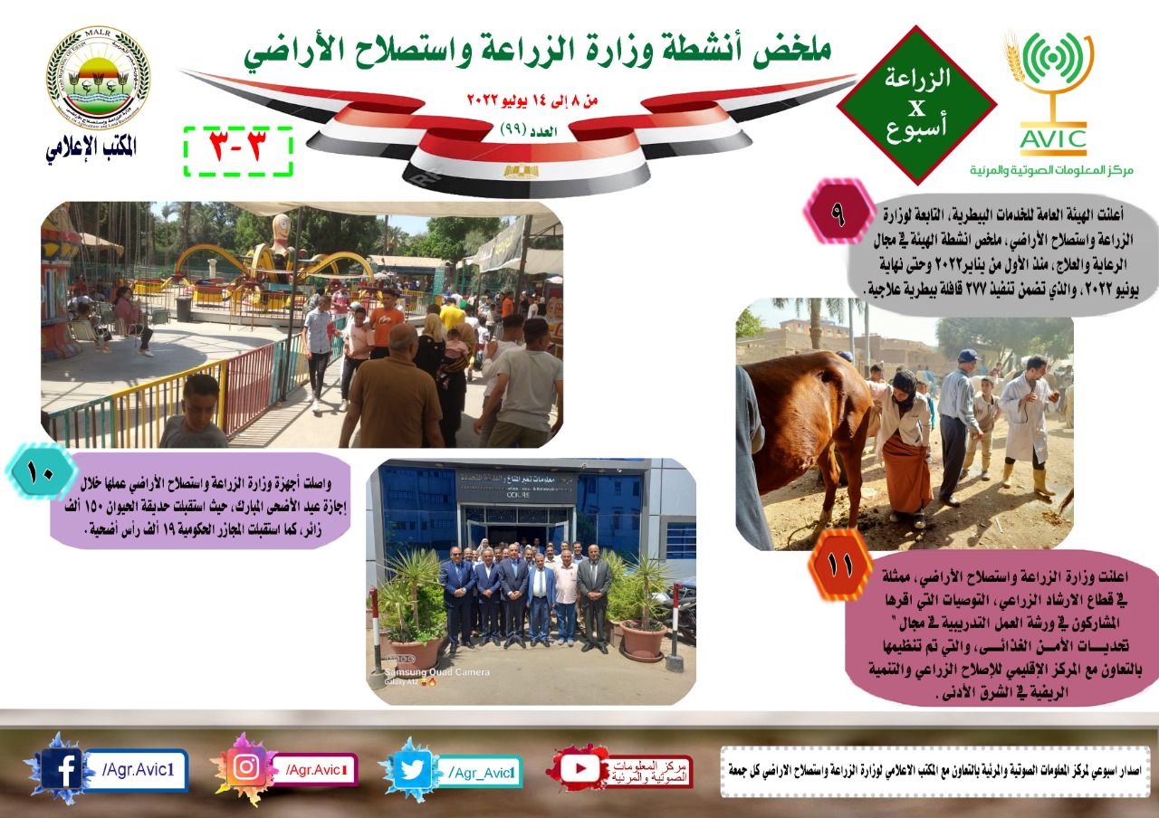 كذلك أعلنت الهيئة العامة للخدمات البيطرية، التابعة لوزارة الزراعة واستصلاح الأراضي، ملخص أنشطة الهيئة في مجال الرعاية والعلاج، منذ الأول من يناير2022 وحتى نهاية يونيو 2022، والذي تضمن تنفيذ 277 قافلة بيطرية علاجية، كما واصلت أجهزة وزارة الزراعة واستصلاح الأراضي عملها خلال إجازة عيد الأضحى المبارك، حيث استقبلت حديقة الحيوان 150 ألف زائر، كما استقبلت المجازر الحكومية 19 ألف رأس أضحية.