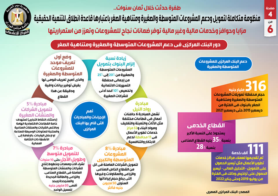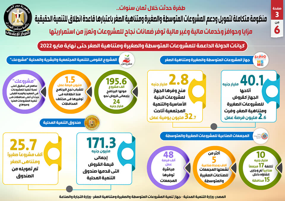 نشر المركز الإعلامي لـ مجلس الوزراء، تقريرًا تضمن إنفوجرافات تسلط الضوء على جهود الدولة في تمويل ودعم المشروعات المتوسطة والصغيرة ومتناهية الصغر باعتبارها قاعدة انطلاق للتنمية الحقيقية، من خلال منظومة متكاملة تشمل مزايا وحوافز وخدمات مالية وغير مالية بما يوفر ضمانات نجاح لتلك المشروعات ويعزز من استمراريتها، وذلك على مدار السنوات الثماني الماضية.