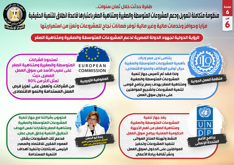 وبدورها، أكدت المفوضية الأوروبية أن الشركات المتوسطة والصغيرة ومتناهية الصغر تستحوذ على نصيب الأسد من سوق العمل المصري حيث تمثل أكثر من 90% من الشركات، حيث تعمل على تعزيز فرص العمل المستدامة والنمو الاقتصادي.
