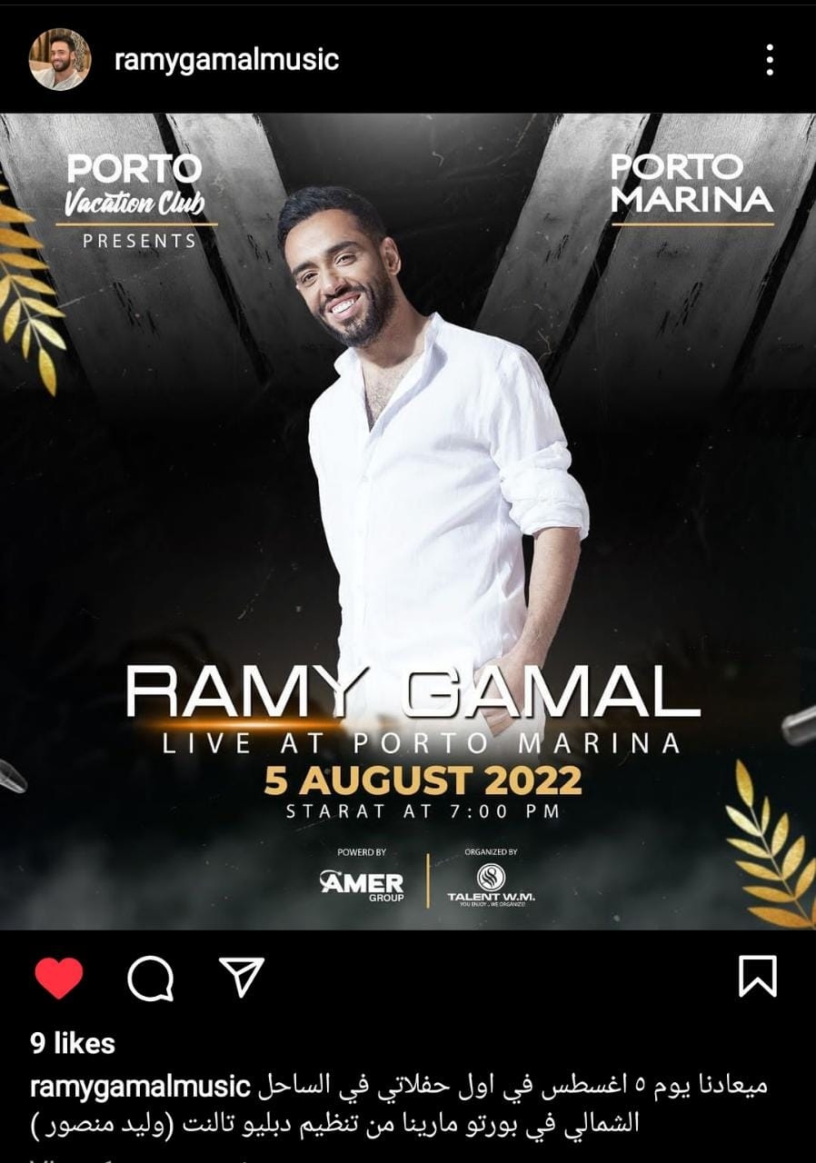 وروح رامي جمال للحفل، من خلال نشر البوستر عبر حسابه الرسمي على موقع تبادل الصور والفيديوهات القصيرة انستجرام، وعلق قائلًا: ميعادنا يوم 5 أغسطس في أول حفلاتي في الساحل الشمالي في بورتو مارينا.
