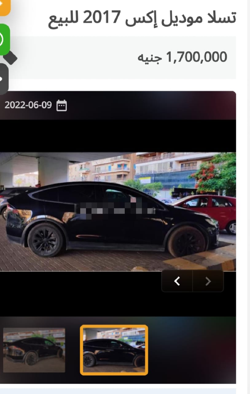 عرض أحد ملاك سيارة تسلا موديل إكس موديل 2017 سيارته بسعر وصل إلى مليون و700 ألف جنيه مصري، وذلك على أحد المواقع المتخصصة في بيع وشراء السيارات المستعملة على شبكة الإنترنت.
