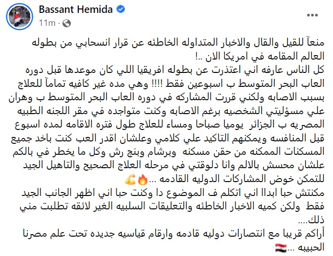 وكتبت بسنت حميدة على صفحتها الشخصية عبر موقع التواصل الاجتماعي فيسبوك: منعا للقيل والقال والاخبار المتداوله الخاطئه عن قرار انسحابي من بطوله العالم المقامه في امريكا الان، كل الناس عارفه اني اعتذرت عن بطوله افريقيا اللي كان موعدها قبل دوره العاب البحر المتوسط ب اسبوعين فقط !!!! وهي مده غير كافيه تمامآ للعلاج بسبب الاصابه، ولكني قررت المشاركه في دوره العاب البحر المتوسط بوهران علي مسؤليتي الشخصيه برغم الاصابه.