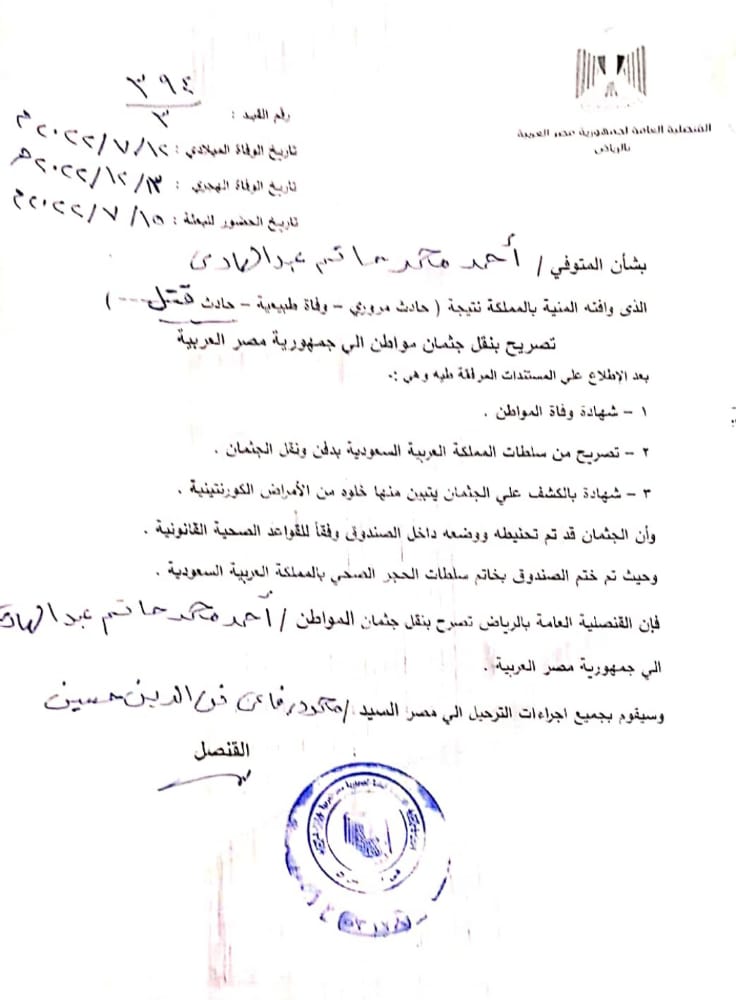 صرحت القنصلية العامة لجمهورية مصر العربية في المملكة العربية السعودية، بنقل جثمان أحمد محمد حاتم، المصري الذي لقى مصرعه قتلًا في السعودية، إلى مصر استعدادًا لدفنه.