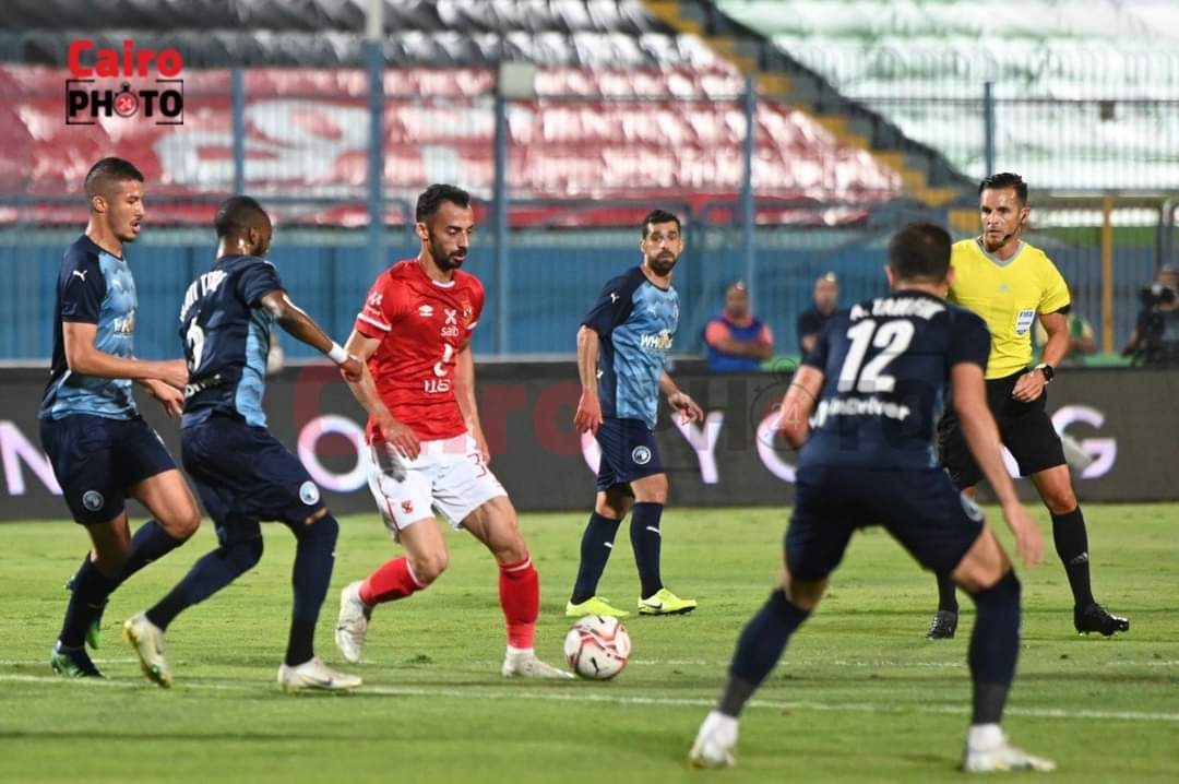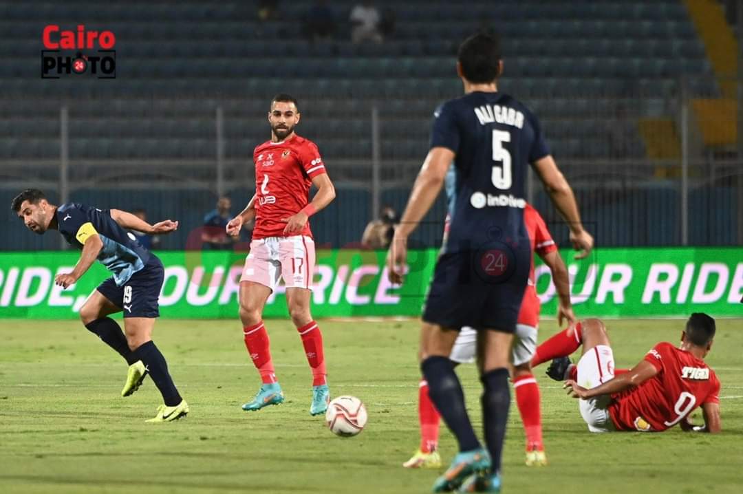 وبدأت المباراة بضغط من جانب لاعبي بيراميدز، ووصلوا بأكثر من محاولة على مرمى محمد الشناوي حارس مرمى الأهلي، كما نجح لاعبو السماوي في تطبيق مصيدة التسلل.