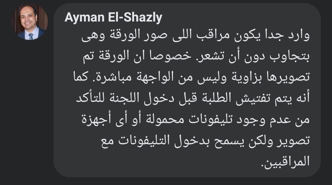 فيما لفت أيمن الشاذلي، في تعليقه أنه يظهر من خلال تصوير الورقة بطريقة عالية أنه شخص غير الطالبة، وبالتالي لابد من فتح تحقيق للتأكيد من هوية المصور، والتأكيد على تفتيش الطلاب لعدم السماح بدخول أي أجهزة إلكترونية للجان