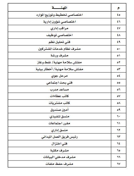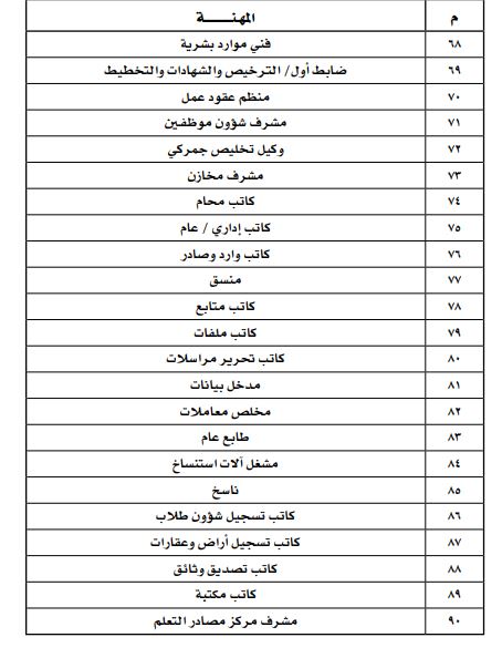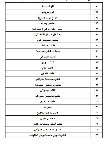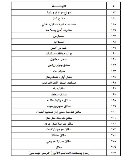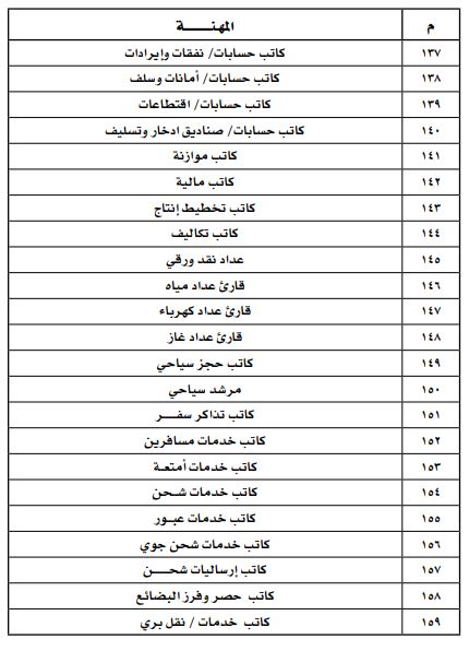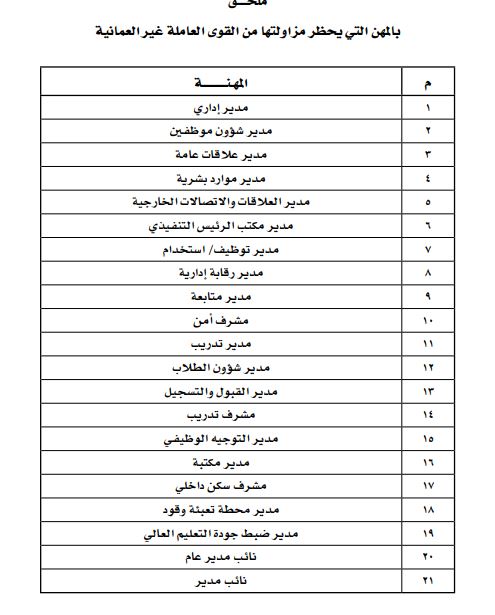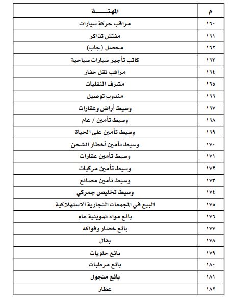 ومن أبرز المهن التي تم الإعلان عن حظرها، مدير الموارد البشرية، ومدير التوظيف، ومدير شؤون الموظفين، ومدير العلاقات العامة، ومدير الاتصالات الخارجية، مشرف أمن وحارس أمن، ومرشد اجتماعي ومرشد سياحي وصراف، وسائقي الحافلات والسيارات العمومية والإسعاف ومركبات الإطفاء.