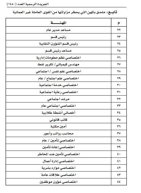 نشرت الجريدة الرسمية العمانية قرارا بحظر عدد 207 وظائف بالسلطنة على غير العمانيين، وفقا لـ قرار تنظيم مزاولة بعض المهن استنادا لـ عددا من المراسيم الملكية.
