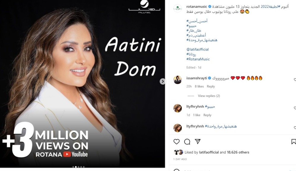 وسبق وكتبت لطيفة عبر حسابها على موقع انستجرام: ألبوم “لطيفة 2022” الجديد تخطى حاجز الـ 3 مليون مشاهدة على موقع يوتيوب خلال يومين فقط من طرحه، وأنهالت عليها التعليقات من محبيها متمنين لها النجاح المستمر.